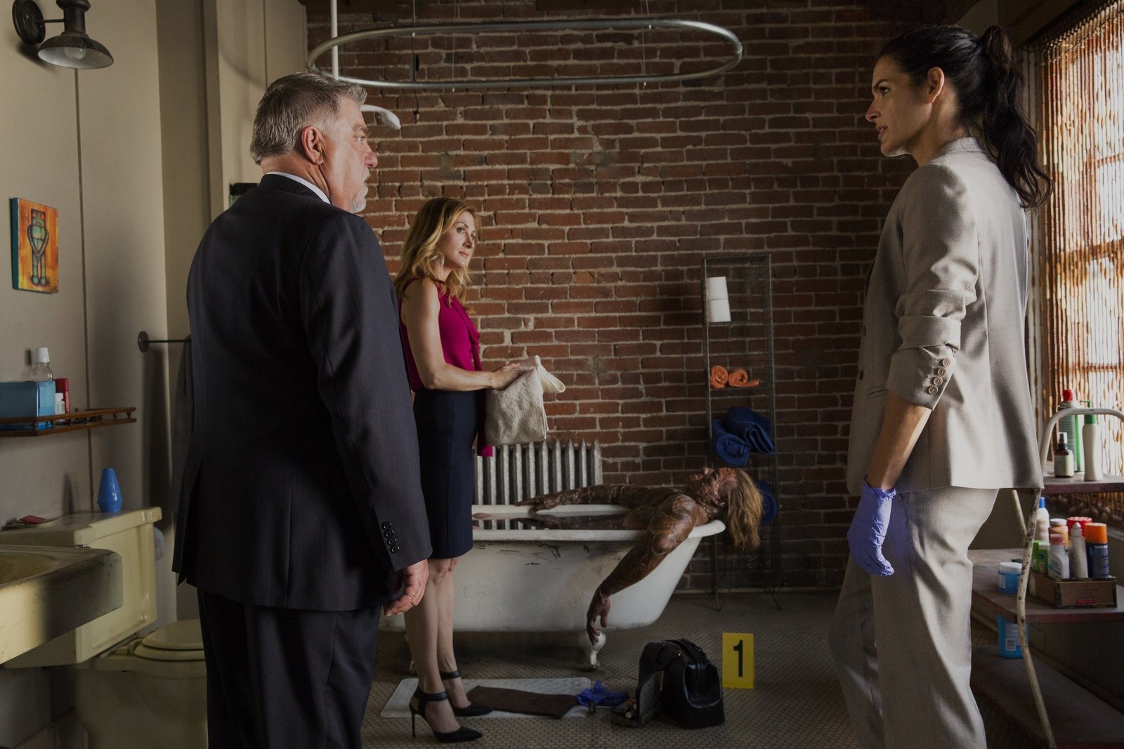 HitzewelleEine männliche Leiche (Darsteller unbekannt) wird in einer mit Eiswasser gefüllten Badewanne gefunden. Maura Isles (Sasha Alexander), Jane Rizzoli (Angie Harmon, r.) und Det. Vince Korsak (Bruce McGill) schauen sich den Tatort genauer an.Bild: © 2014 Warner Bros. Entertainment, Inc. Lizenzbild frei