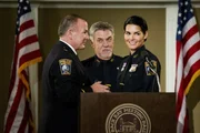 ExplosivJane Rizzoli (Angie Harmon) wird mit einem Heldenorden geehrt. Doch auch wenn sie sich nicht als Heldin sieht, hilft es ihr nicht: Sie muss ihren Orden von Cavanaugh (Brian Goodman, l.) und Korsak (Bruce McGill) entgegen nehmen.Bild: © TVNOW / Warner Bros