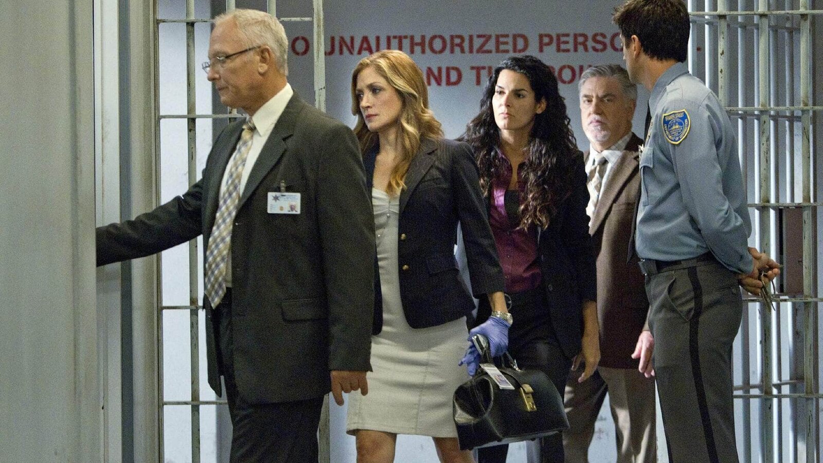 NemesisDer Gefängnisdirektor (v.l.) Price (Conor O'Farrell) führt Maura Isles (Sasha Alexander), Jane Rizzoli (Angie Harmon) und Korsak (Bruce McGill) zum Tatort: Ein Häftling wurde kurz vor seiner Entlassung brutal niedergestochen.Bild: © TVNOW/ Warner Brothers Die Verwendung des VOX-Bildmaterials ist nur zur redaktionellen Berichterstattung im Zusammenhang mit der jeweiligen Sendung unter Angabe der Credits/Quellenangabe und Beachtung