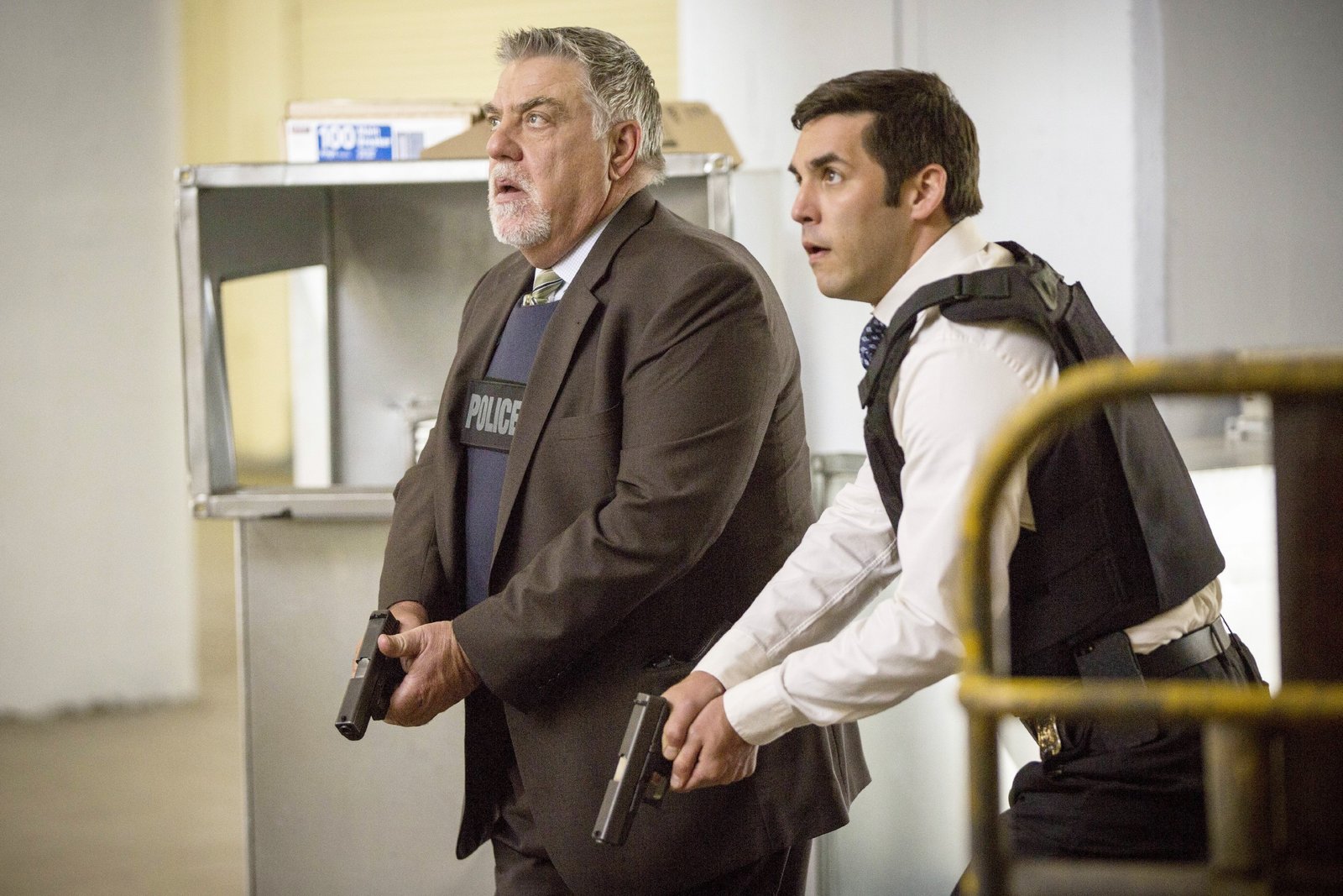 05:26Vince Korsak (Bruce McGill) hält über Funk Kontakt zu den Personen, die sich in einem evakuierten Gebäude befinden, um ihnen Anweisungen zu geben. Kann der Täter dadurch gefasst werden?Bild: © VOX / Warner Bros.