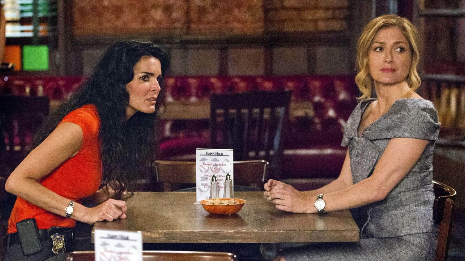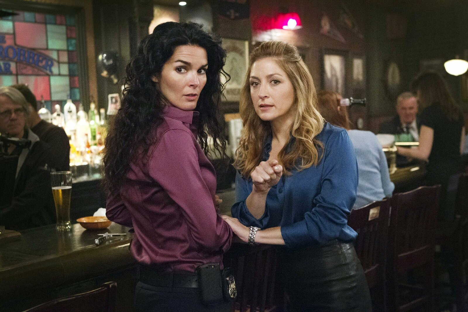 Blutige HochzeitJane Rizzoli (Angie Harmon, l.) beobachtet mit Kollegin Maura Isles (Sasha Alexander) ihre neue Mitbewohnerin. Diese zieht die Blicke vieler Männer auf sich. Doch etwas stimmt nicht mit der jungen, attraktiven Frau. Nur was?Bild: © TVNOW / Warner Bros