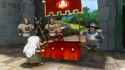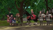 Der Kuschelhamster und der DracheRobin (4.v.l.) lenkt Prinz John (3.v.r.) ab.Bild: © ZDF und © 2018 – Method Animation – DQ Entertainment Intern