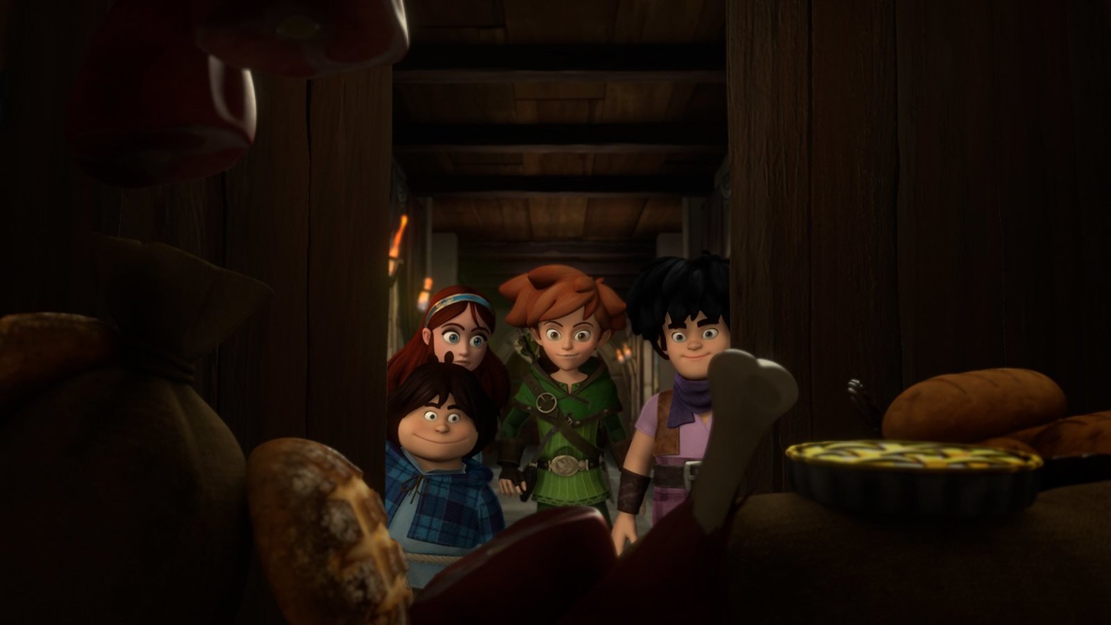 Die Speisekammer des PrinzenTuck, Marian, Robin Hood und Little John haben die gefüllte Speisekammer des Prinzen gefunden.Bild: © ZDF und 2014 Method Animation