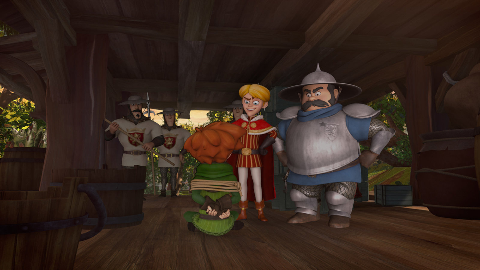 KönigspostRobin Hood wurde von den Soldaten gefesselt. Prinz John und der Sheriff sind gekommen, um sich davon zu überzeugen.Bild: © ZDF und 2014 Method Animation