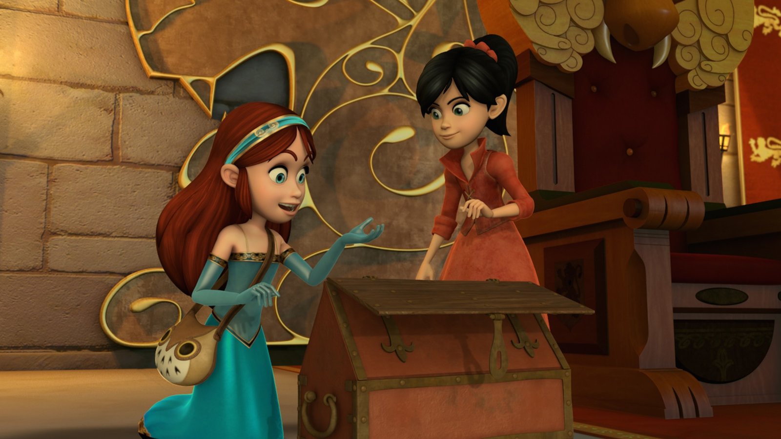 Der SpionMarian und Scarlett vor der Schatztruhe von Prinz John. Das Gold ist doch da - nur unsichtbar.Bild: © ZDF/Method Animation/DQ Entertainment/Fabrique d'images/ZDF Enterprises/De Agostini