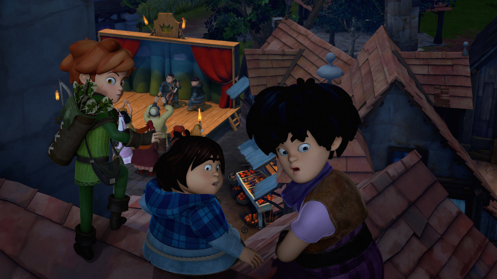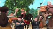VergeigtDie Söhne des Sheriffs, Ralf und Rolf sind die ersten Kandidaten beim Musikwettbewerb. Robin und seine Freunde Tuck und Little John beobachten es aus der Ferne, als plötzlich Scarlett um Hilfe ruft.Bild: © ZDF und 2014 Method Animation