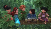 Der FallenstellerRobin (2.von rechts) und seine Freunde überlegen, wie sie den Fallensteller ausfindig machen können. ÂBild: © ZDF/Method Animation/DQ Entertainment