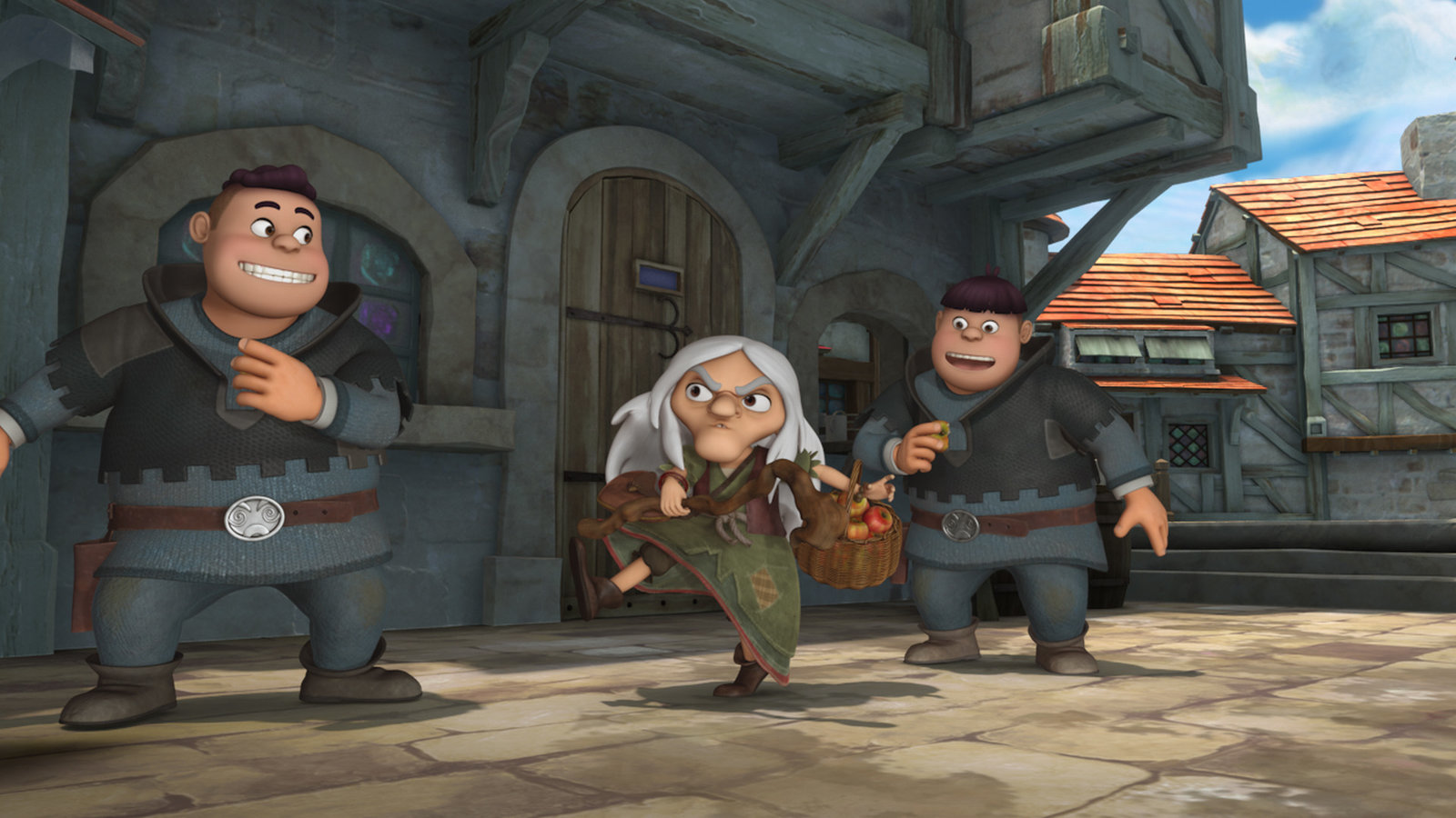 HexereiDie zwei Söhne des Sheriffs, Ralf und Rolf, ärgern eine alte Dorfbewohnerin.Bild: © ZDF und 2014 Method Animation