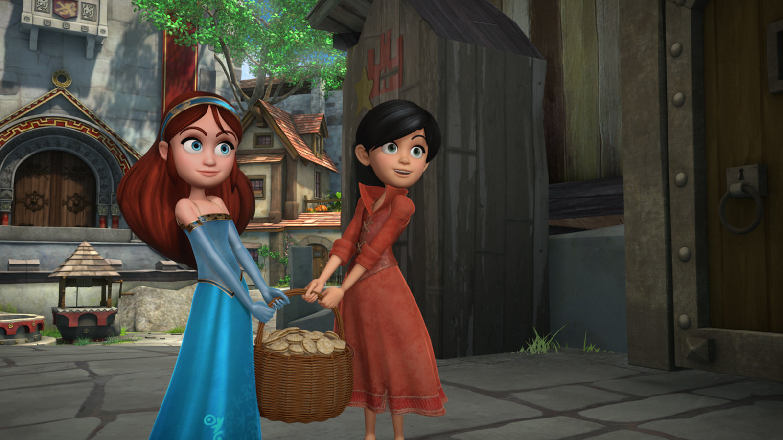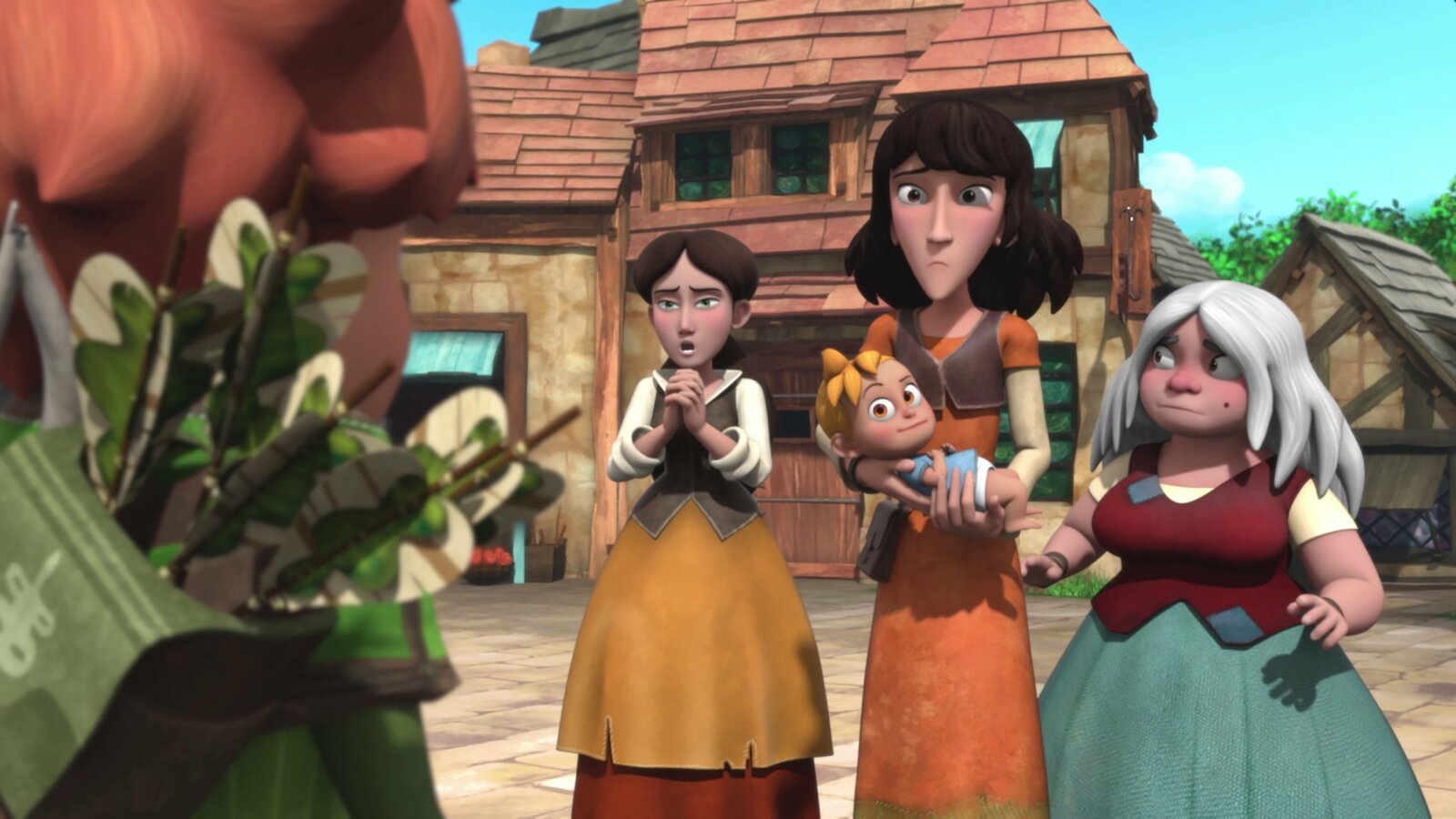 Feuer in SherwoodDie Dorfbewohnerinnen erzählen Robin von den seltsamen Dieben.Bild: © ZDF/Method Animation/DQ Entertainment