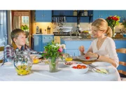 Die Frau auf der KlippeFrühstück mit dem Sohn: Vincent Borko als Toby, Mira Bartuschek als HollyBild: © SRF/ZDF/Jona Ailes