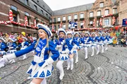 Der Rosenmontagszug aus Düsseldorf zieht unter dem Motto "Unser Rad schlägt um die Welt" durch die NRW-Landeshauptstadt. - Tanzgarde auf dem Rathausplatz in DüsseldorfBild: © WDR/Thomas von der Heiden