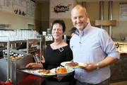 Das "Mad Joe's" in Wernigerode und das Traditionsrestaurant "Hirsch" in OederanIm sächsischen Oederan ist Rosins Hilfe gefragt: Das Traditionsrestaurant "Hirsch" steht kurz vor der Pleite. Kann Sternekoch Frank Rosin (l.) Chefin Nicole Bibrach (r.) und ihrem Team dabei helfen, das Restaurant wieder zum Laufen zu bringen?Bild: © kabel eins Eigenproduktionsbild frei