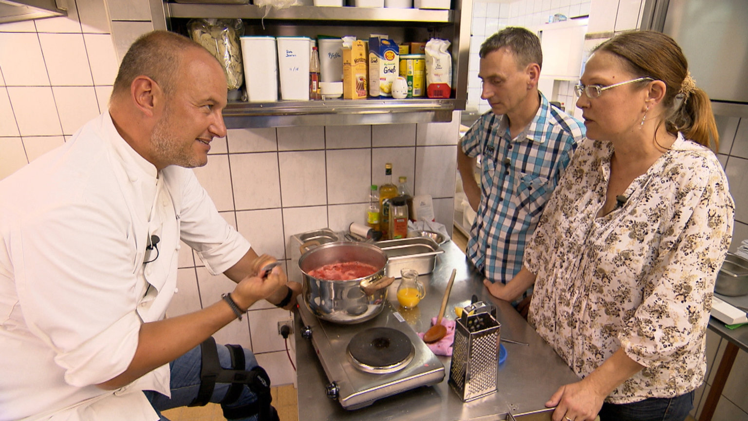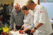 "Zum Stausee" in NiederhausenFrank Rosin (l.) beim Kochcoaching mit Inhaber Detlef Matthes (M.) und Ehefrau Petra Best-Matthes (r.) ...Bild: © kabel eins Eigenproduktionsbild frei