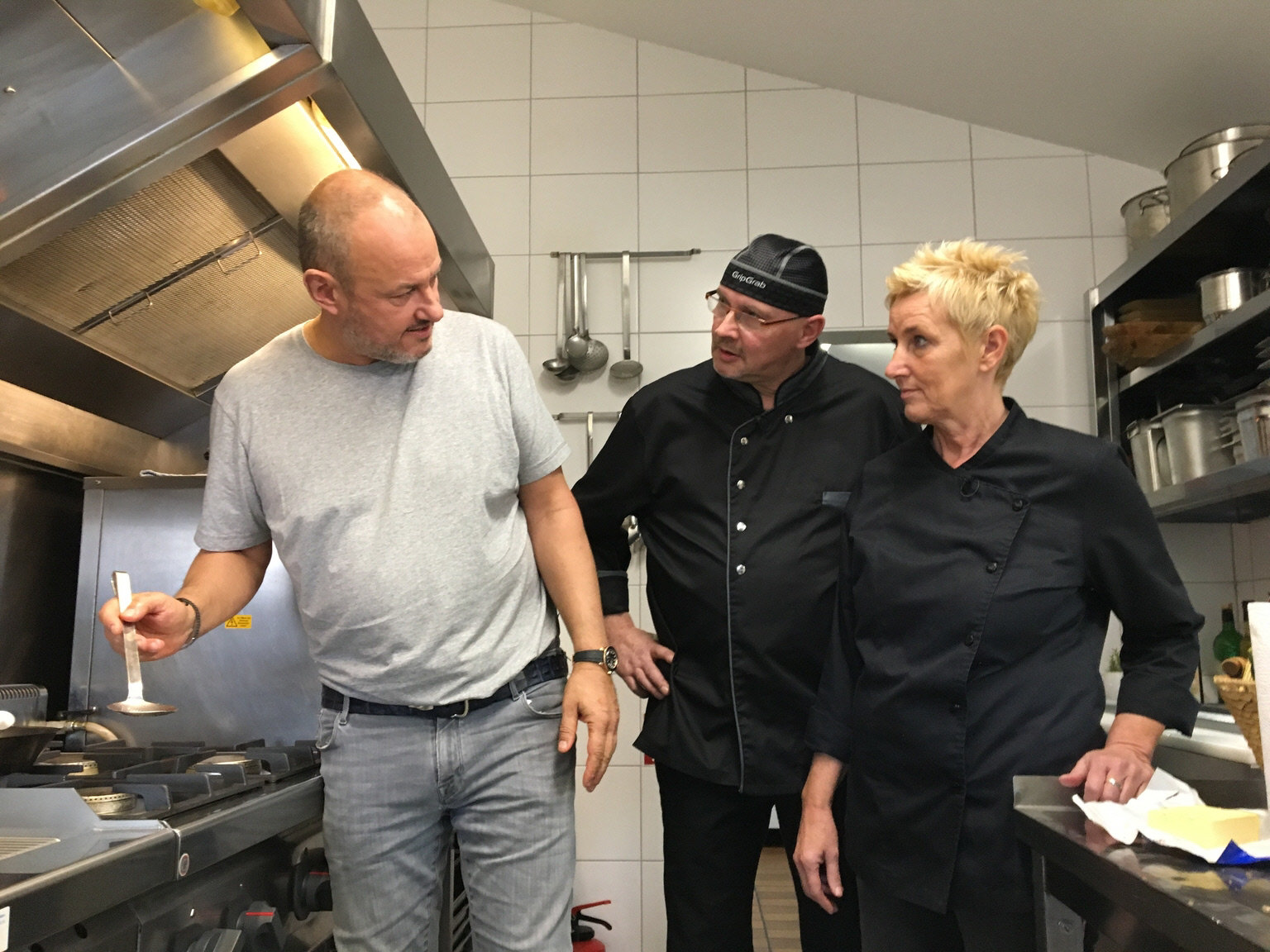 "Landhaus Eyendorf" in Eyendorf (Lüneburger Heide)Küchenhilfe Klaudia (r.) und ihr Chef Oliver (l.) hoffen, dass Frank Rosin (M.) ihnen Tipps geben kann, wie sie das "Landhaus Eyendorf" vor dem finanziellen Ruin bewahren können ...Bild: © kabel eins Eigenproduktionsbild frei