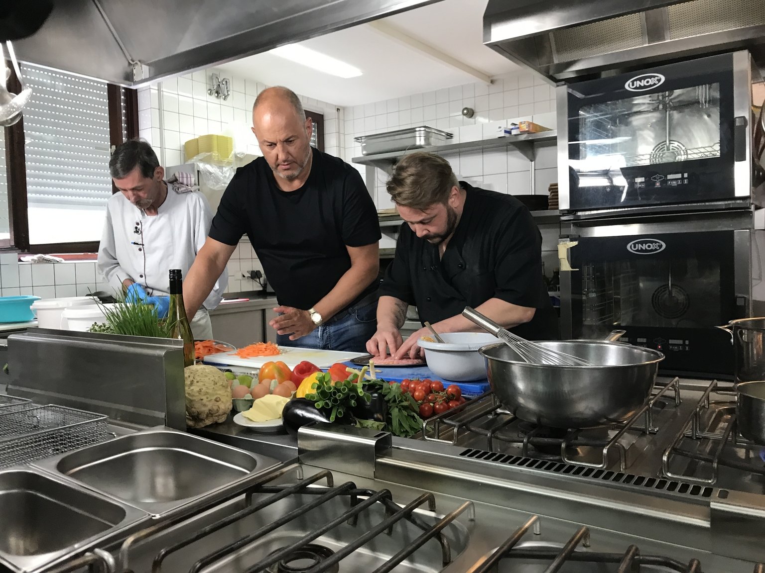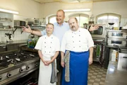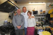 "Landhaus Eyendorf" in Eyendorf (Lüneburger Heide)Küchenhilfe Klaudia (r.) und ihr Chef Oliver (l.) hoffen, dass Frank Rosin (M.) ihnen Tipps geben kann, wie sie das "Landhaus Eyendorf" vor dem finanziellen Ruin bewahren können ?Bild: © kabel eins Eigenproduktionsbild frei
