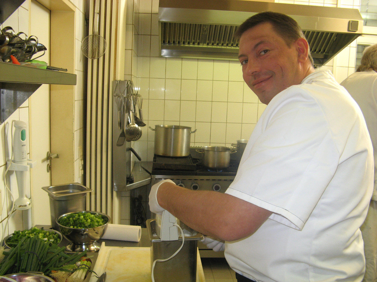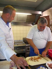 Landgasthof "Schmiedwirt" in Petershausen bei MünchenKüchenhilfe Kitty (r.) lässt sich gerne Tipps vom Sternekoch Frank Rosin (l.) geben.Bild: © kabel eins / Walter Wehner