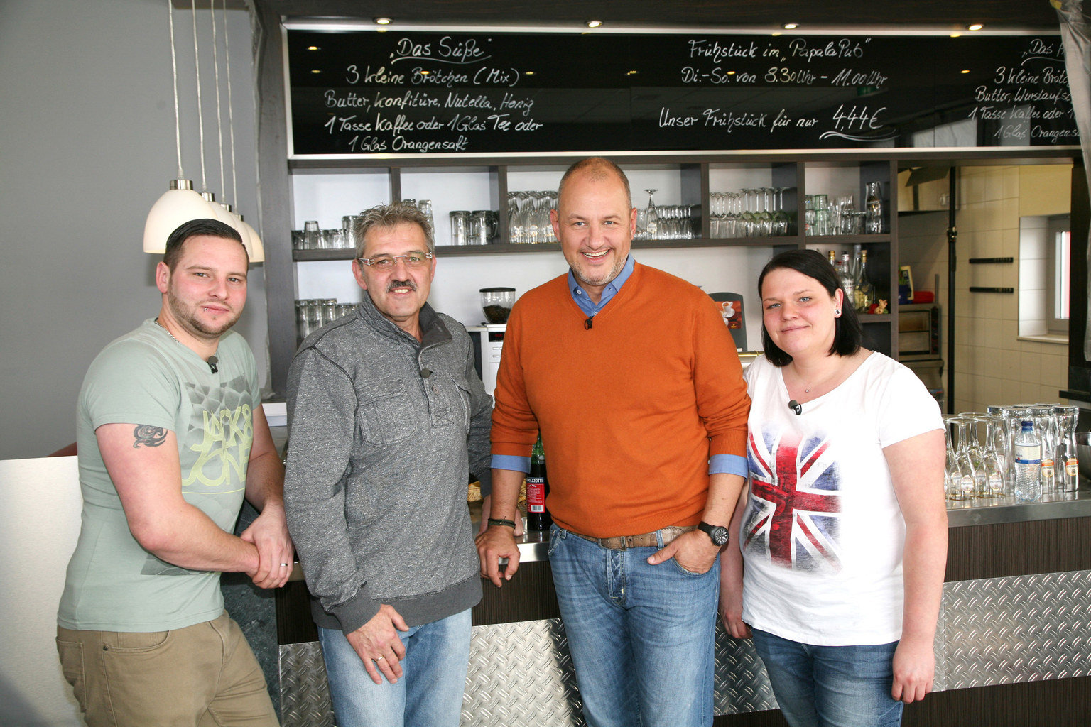 Bistro "Papala Pub" (Cuxhaven)Axel (2.v.l.) investierte seine kompletten Ersparnisse und sogar seine Kinder Janine (r.) und Marcel (l.) beteiligten sich an dem neuen Bistro ihres Vaters. Doch jetzt bleiben die Gäste aus. Kann Frank Rosin (2.v.r.) der Familie helfen?Bild: © kabel eins Eigenproduktionsbild frei
