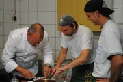 Restaurant "Hexenkessel" bei KielFrank Rosin (l.) gibt Ronny (M.) und Florian (r.) wichtige Tipps.Bild: © kabel eins Eigenproduktionsbild frei