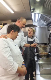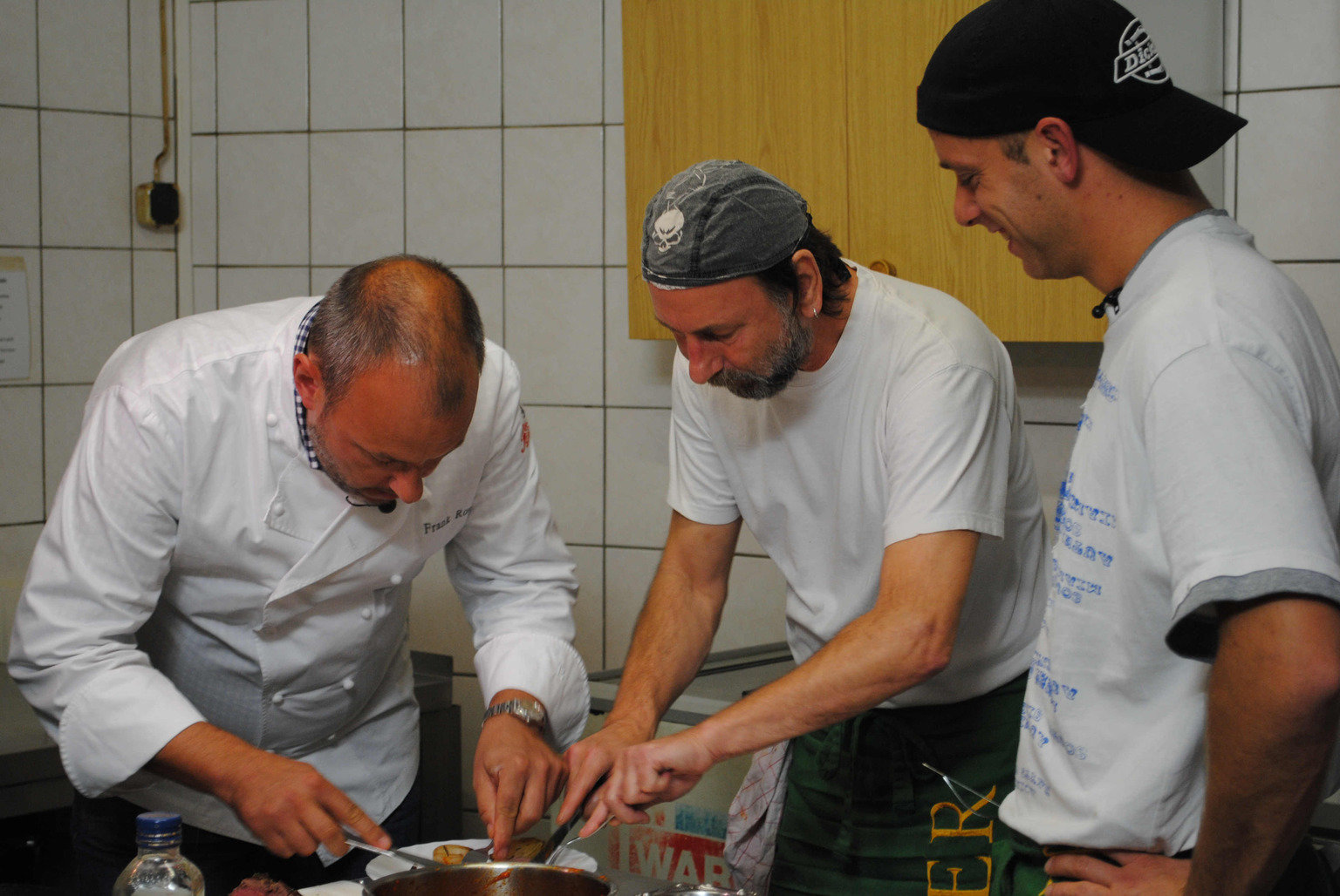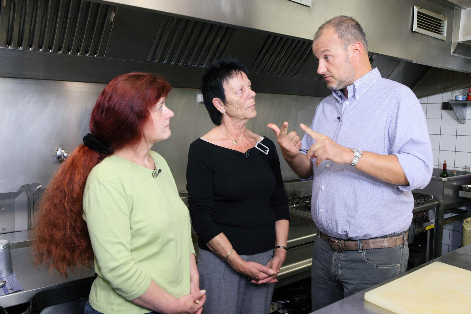 Die "Zehntscheune" in EsslingenTipps vom Fachmann: Sternekoch Frank Rosin (l.) erklärt Uschi Herrmann (M.), Inhaberin des "Wulle Stüble" im schwäbischen Esslingen, und ihrer Küchenhile Radenka Damijanovic (r.), was man besser machen kann ...Bild: © kabel eins Eigenproduktionsbild frei
