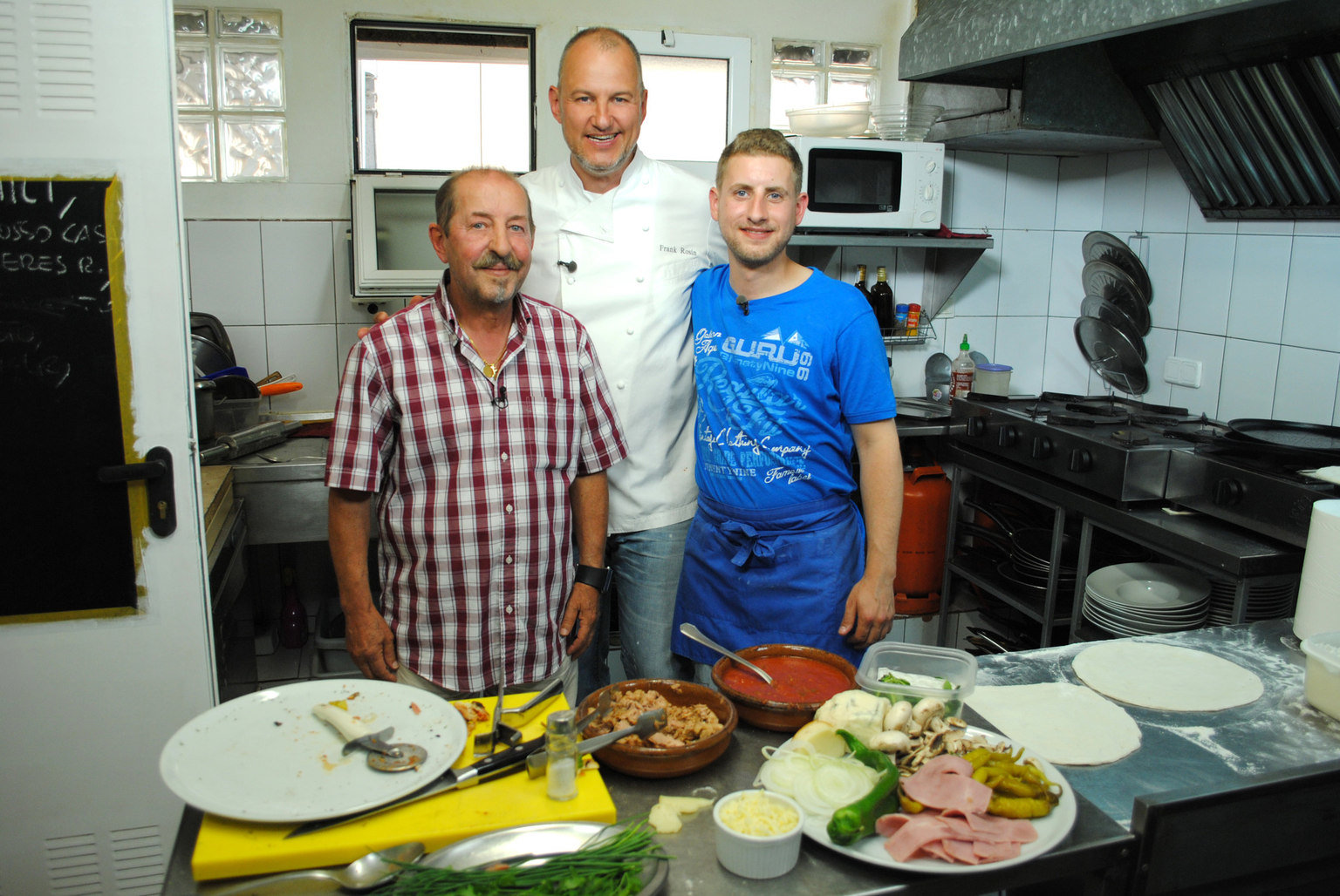 "Fellini" in PalmaCoaching vom Sternekoch: Frank Rosin (M.) mit "Fellini"-Inhaber Raffaele Rosa (l.) und dessen Sohn Vincenco "Enzo" Rosa (r.) ...Bild: © kabel eins