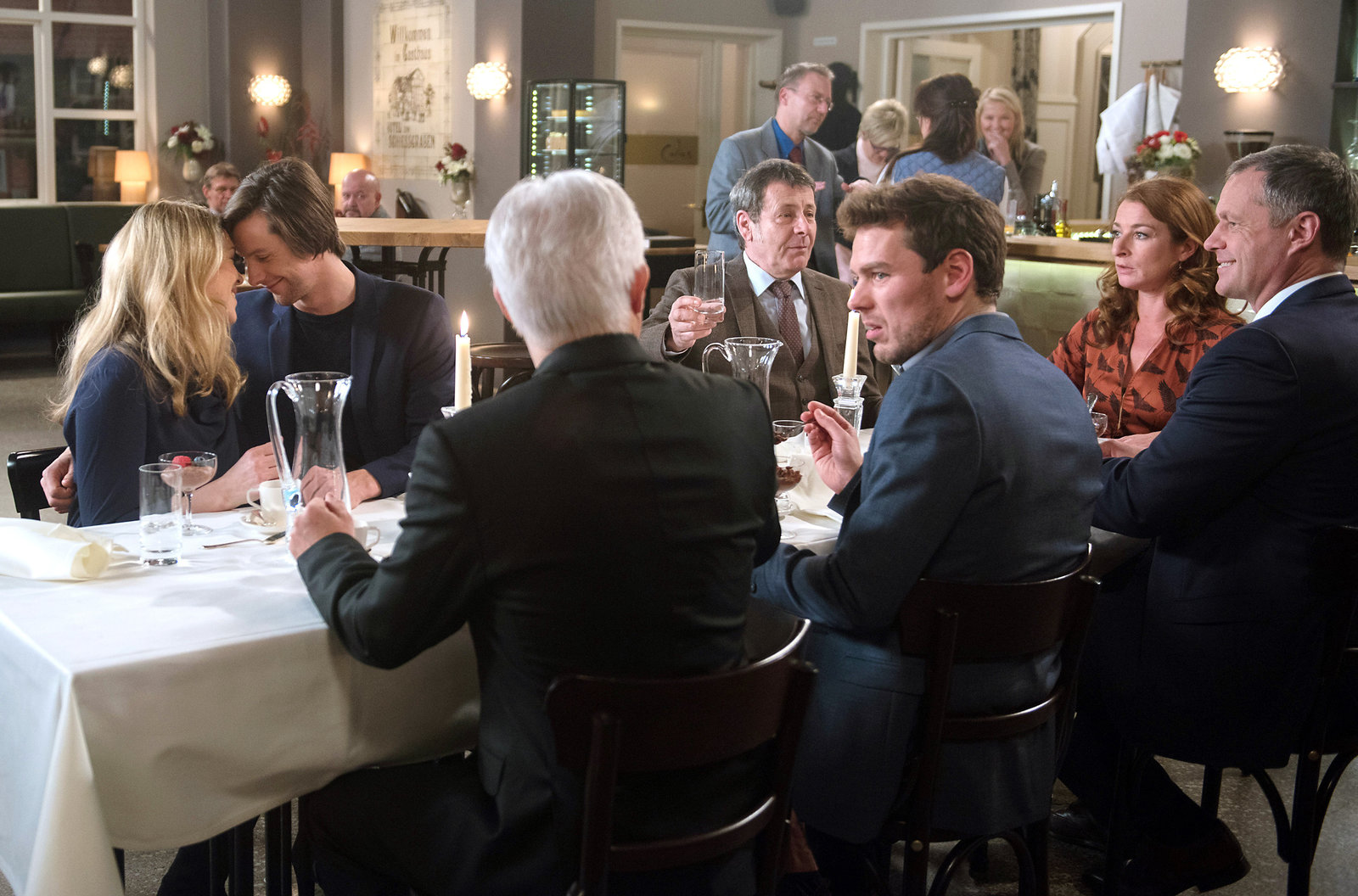 Der AusbruchCarla (Maria Fuchs, 2.v.r.) verliert die Nerven, als sie sieht, wie Timo (Jonathan Beck, 2.v.l.) und Britta (Jelena Mitschke, l.) sich öffentlich küssen (mit Hermann Toelcke, 4.v.r., Gerry Hungbauer, 3.v.l., Constantin Lücke, 3.v.r., Joachim Kretzer, r. und Komparsen, hinten).Bild: © ARD/Nicole Manthey