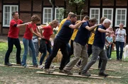 Die Erntedank-OlympiadeGregor (Wolfram Grandezka, l.), Sonja (Madeleine Niesche, 2.v.l.), Eva (Andrea Lüdke, 3.v.l.), Tilmann (Björn Bugri, 3.v.r.), Gunter (Hermann Toelcke, 2.v.r.) und Thomas (Gerry Hungbauer, r.) wetteifern bei der Erntedank-Olympiade um die beste Platzierung (mit Komparsen, hinten).Bild: © ARD/Nicole Manthey