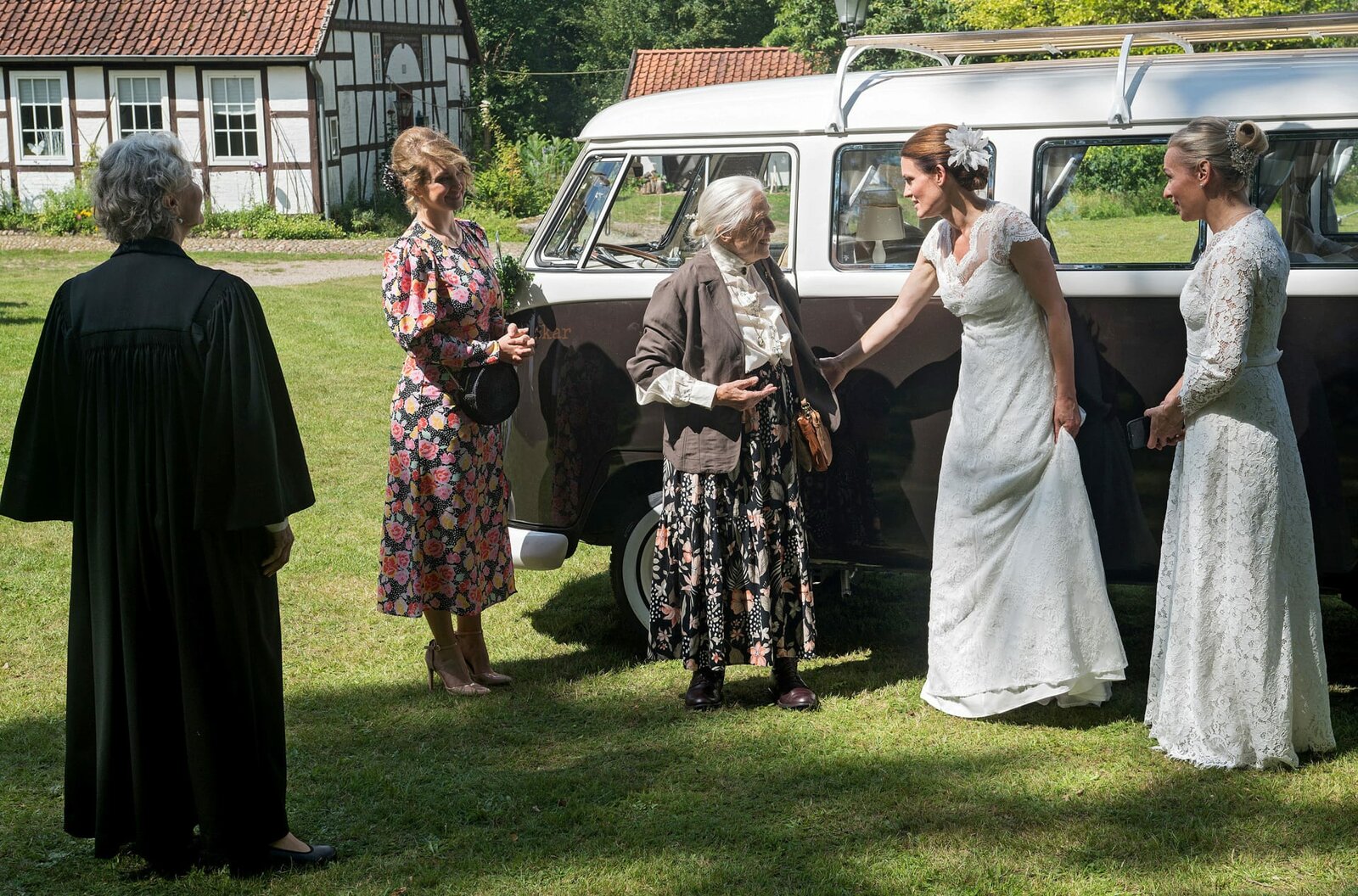 Der Hochzeits-BusDoppelhochzeit: Tatjana (Judith Sehrbrock, 2.v.r.) ist überglücklich, dass ihre Großmutter Babuschka (Maria Mägdefrau, M.) zur Hochzeit kommen konnte. Dörte (Edelgard Hansen, l.), Sara (Antonia Jungwirth, 2.v.l.) und Mona (Jana Hora-Goosmann, r.) begrüßen den Überraschungsgast herzlich.Bild: © ARD/Nicole Manthey