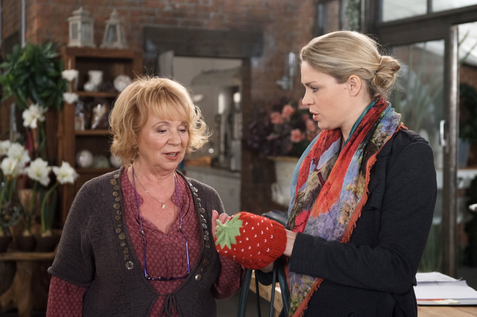 Auftrag zum MordBritta (Jelena Mitschke, r.) ist begeistert von Erikas (Madeleine Lierck-Wien, l.) Baby-Stricksachen im Erdbeerdesign.Bild: © ARD/Nicole Manthey
