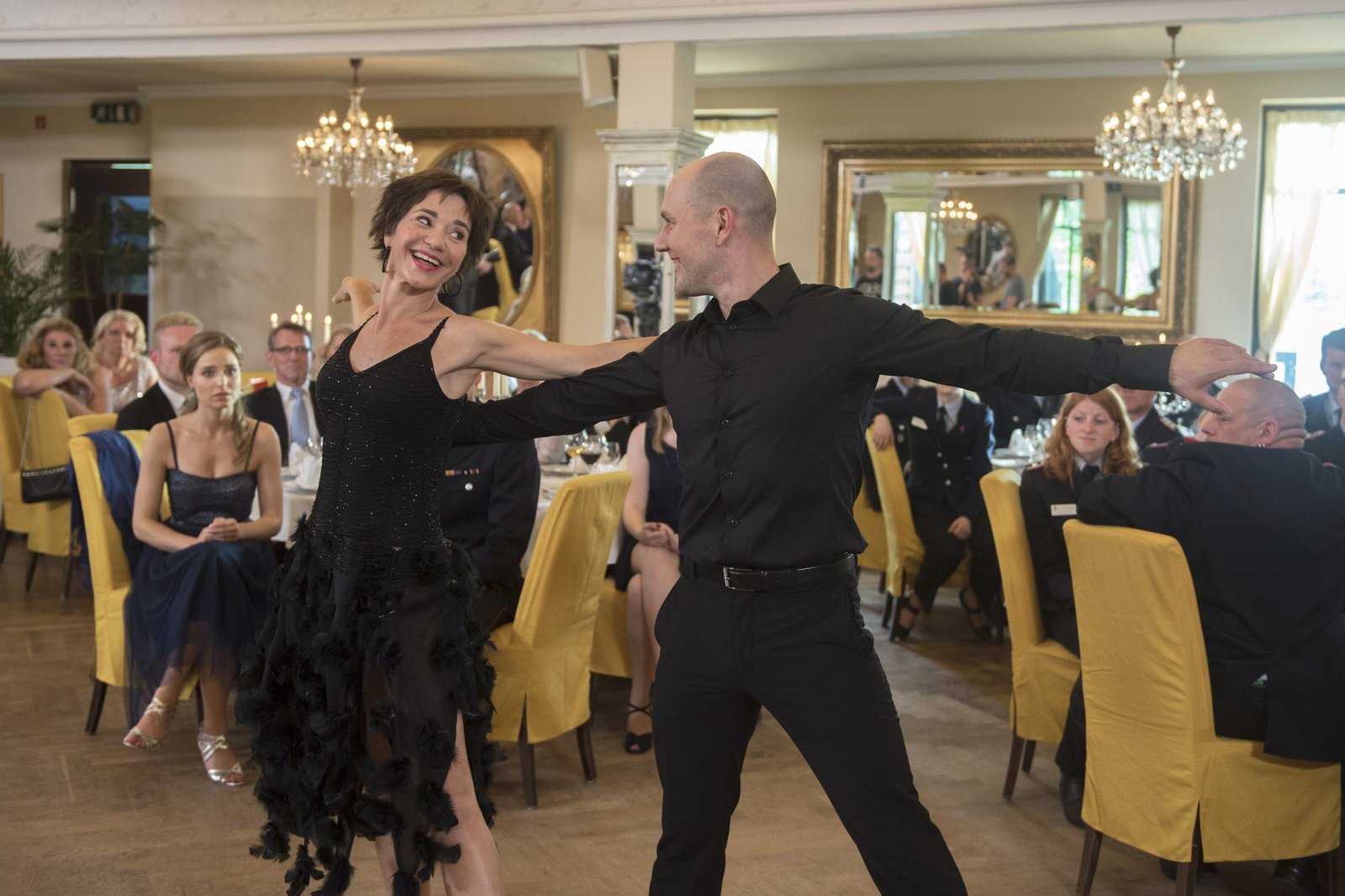 Der TanzabendMerle (Anja Franke, l.) legt einen fulminanten Eröffnungstanz mit Renè (Oliver P., l.) hin (mit Komparsen).Bild: © ARD/Nicole Manthey