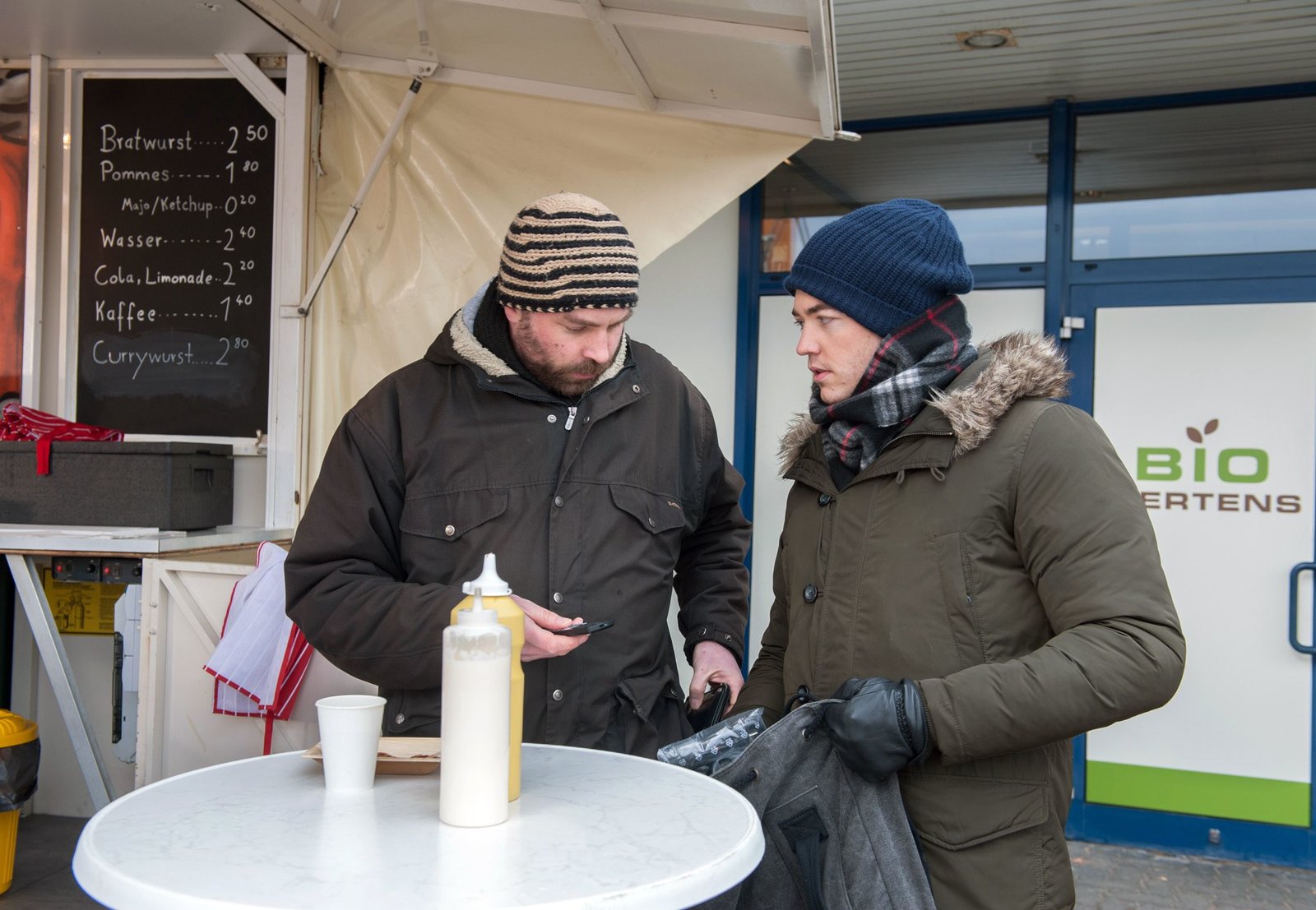 Das Wurstbuden-ComebackTheo (Frederic Böhle, r.) will mit Johanna (Brigitte Antonius, l.) einen Joint rauchen. Doch der ist spurlos verschwunden.Bild: © ARD/Nicole Manthey