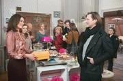 Zwischen den FrontenHelen (Patricia Schäfer, l.) freut sich über Peers (Jörg Pintsch, 2.v.r.) originelles Geschenk (mit Malin Steffen, 2.v.l., Claus Dieter Clausnitzer, 3.v.l., Dana Golombek, M., Madeleine Lierck-Wien, 5.v.r., Frederic Böhle, 4.v.r., Samantha Viana, 3.v.r. und Komparsen).Bild: © ARD/Nicole Manthey