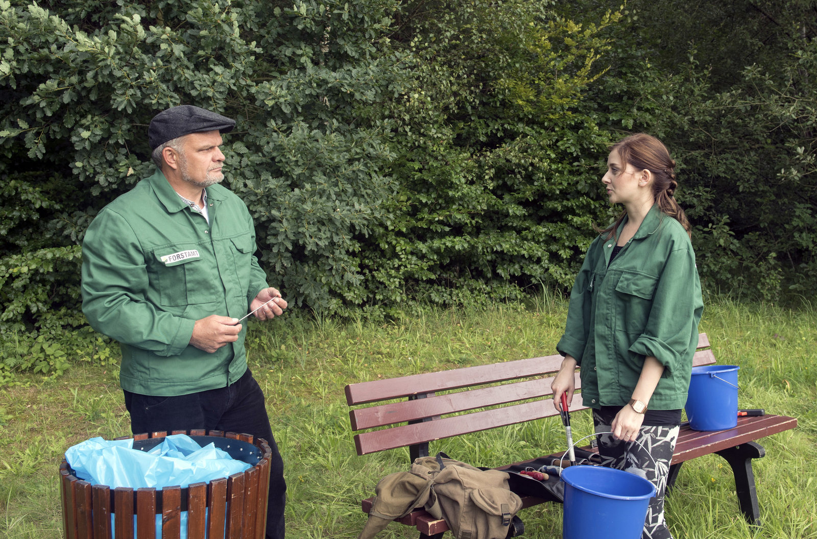 Romantik am LagerfeuerPia (Clara Apel, l.) und Bruno (Wolfgang Häntsch, r.) stellen mit Entsetzen fest, dass jemand die Heugabelkäfer weggeschafft hat.Bild: © ARD/Nicole Manthey
