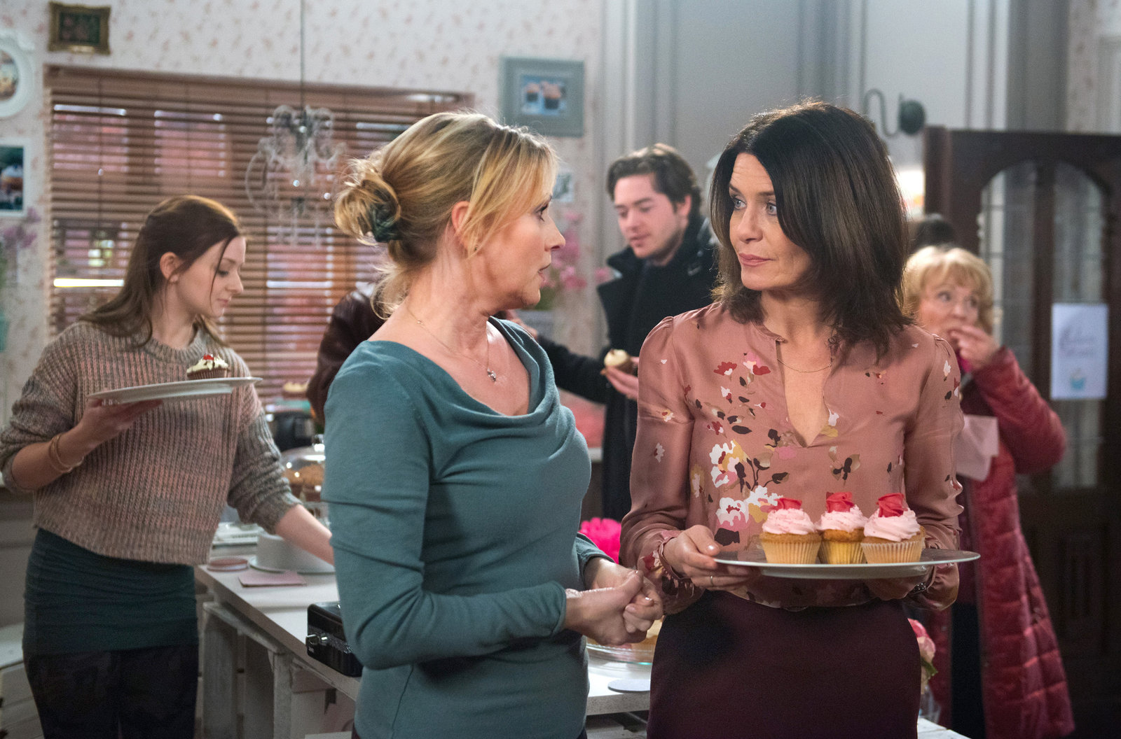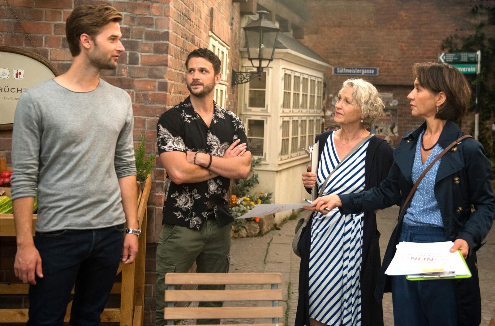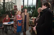 Die EröffnungSigrid (Dana Golombek, 2.v.l. mit Malin Steffen, l.) spürt, wie enttäuscht Helen (Patricia Schäfer, 2.v.r. mit Frederic Böhle, M. und Madeleine Lierck-Wien, r.) ist, dass Arne sie bei der Ladeneröffnung im Stich lässt.Bild: © ARD/Nicole Manthey