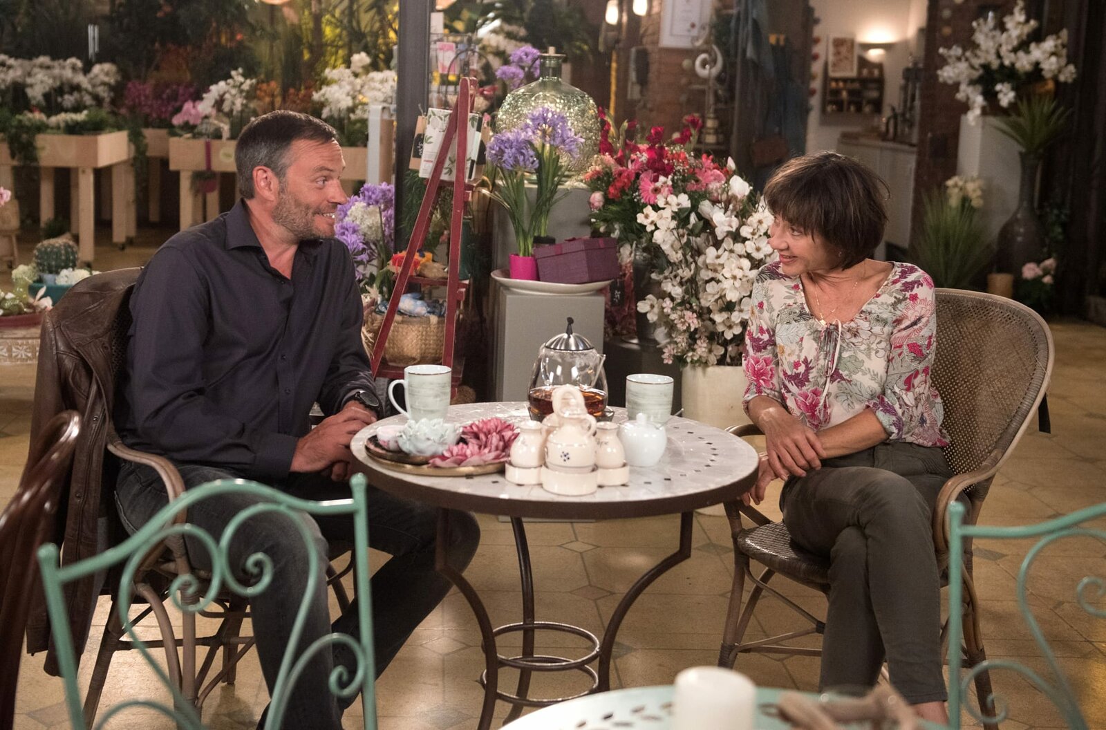 Ein unerwarteter AnrufTrotz gegensätzlicher politischer Ansätze flirten Merle (Anja Franke, r.) und Heiko (Sebastian Herrmann, r.) gern miteinander.Bild: © ARD/Nicole Manthey