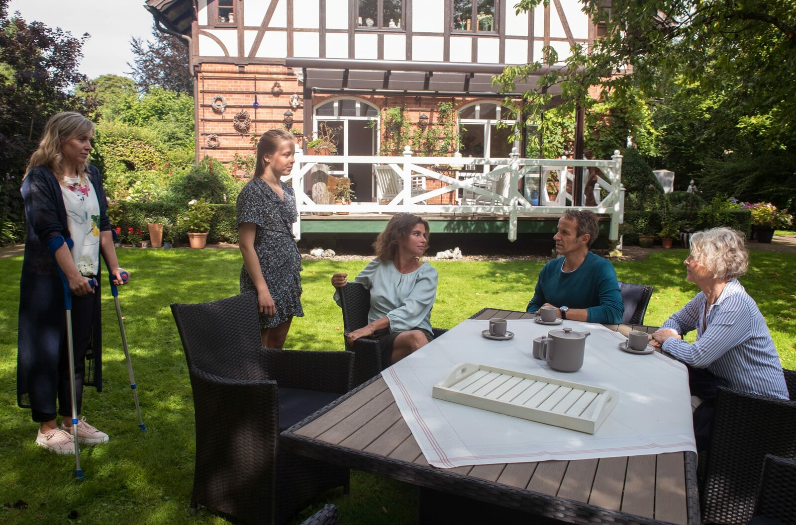 FreiheitAnke (Anne Brendler, M.) und Florian (Stefan Plepp, 2.v.r.) sind erleichtert, als Katrin (Nicole Ernst, l.) Mia (Leonie Beuthner, 2.v.l.) zu einem Kompromiss überreden kann (mit Edelgard Hansen, l.).Bild: © ARD/Nicole Manthey