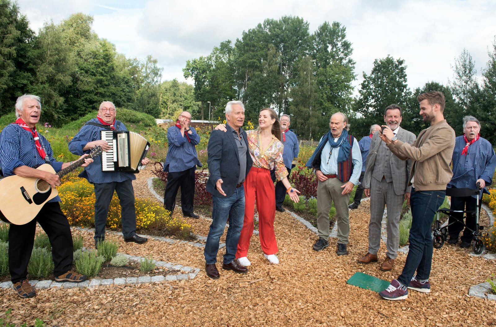 Die Frau an der SeiteThomas (Gerry Hungbauer, l.) ist gerührt von dem herzlichen Abschied. Er wird Jule (Kim Sarah Brandts, 2.v.l.) nach Brasilien begleiten. Hannes (Claus Dieter Clausnitzer, M.), Gunter (Hermann Toelcke, 2.v.r.) und Simon (Thore Lüthje, r.) verabschieden Thomas gebührend, mit dem Gesang des Shanty-Chors aus Lüneburg.Bild: © ARD/Nicole Manthey