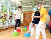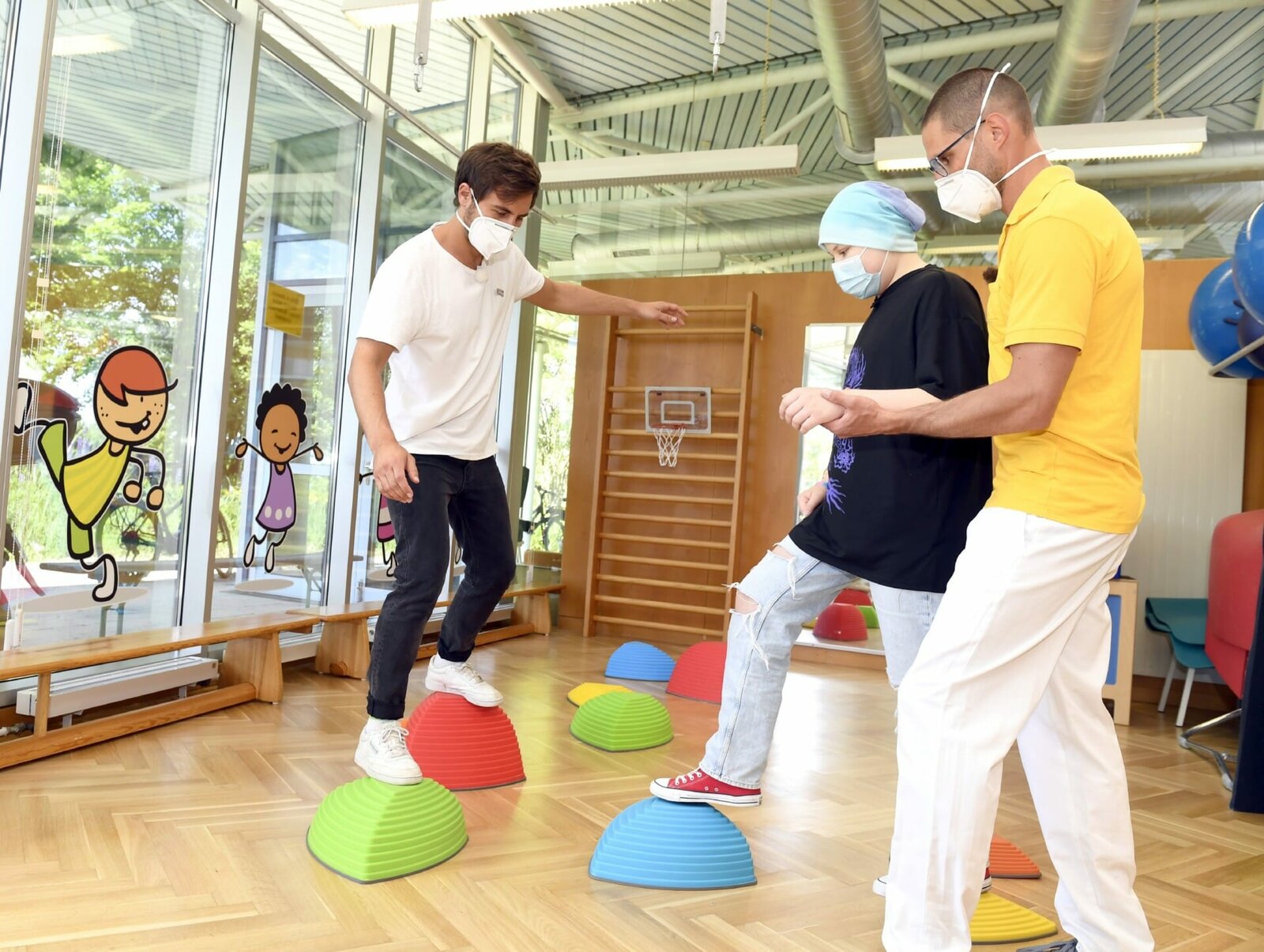 Max Giesinger (l.) besucht als Projektpate f¸ür "RTL-Wir helfen Kindern" das Universitätsklinikum Regensburg. Patientin Rebecca Kronawitter macht Gleichgewichts¸Übungen mit Physiotherapeut Sebastian Meier. Achtung: Bei Verˆffentlichung m¸ssen "RTL-Spendenmarathon", bzw. "Stiftung RTL - Wir helfen Kindern" erw‰hnt werden!!Bild: © RTL Deutschland / Frank Rollitz
