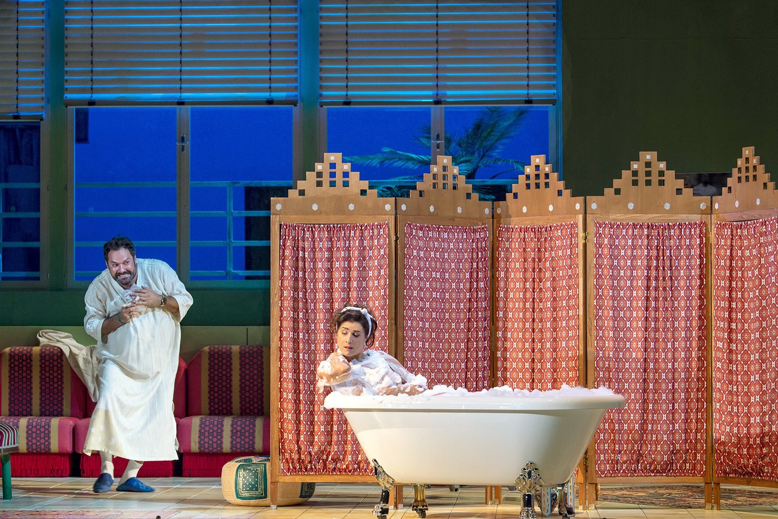 Bald weiß Mustafà (Ildar Abdrazakov) nicht mehr, wie ihm geschieht: Die schöne schiffbrüchige Isabella (Cecilia Bartoli) verdreht dem türkischen Bey von Algier gehörig den Kopf.Bild: © BR
