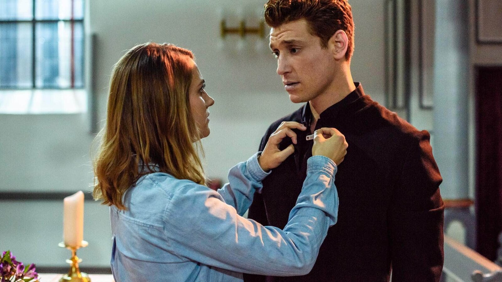 Padre Mobile oder den letzten beißen die HundeEva (Bettina Burchard) überrascht Maik (Daniel Donskoy) in der Kirche. Weiß sie mittlerweile, wer der Pfarrer wirklich ist?Bild: © TVNOW / Julia Feldhagen