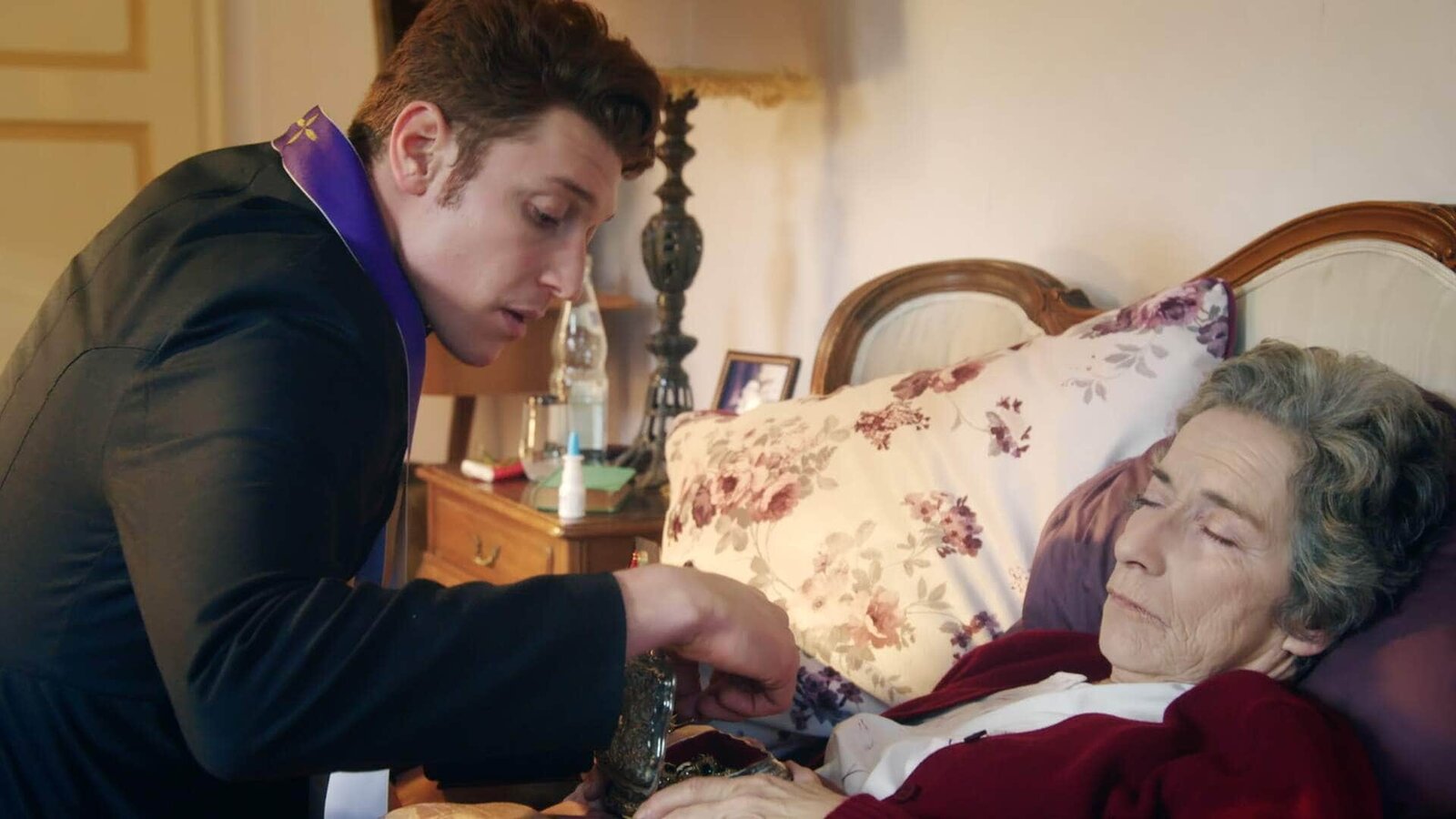 Vom Regen in die KircheFrau von Meyer (Gabriele Schulze) erhält von Maik (Daniel Donskoy) die letzten Ölung.Bild: © RTL