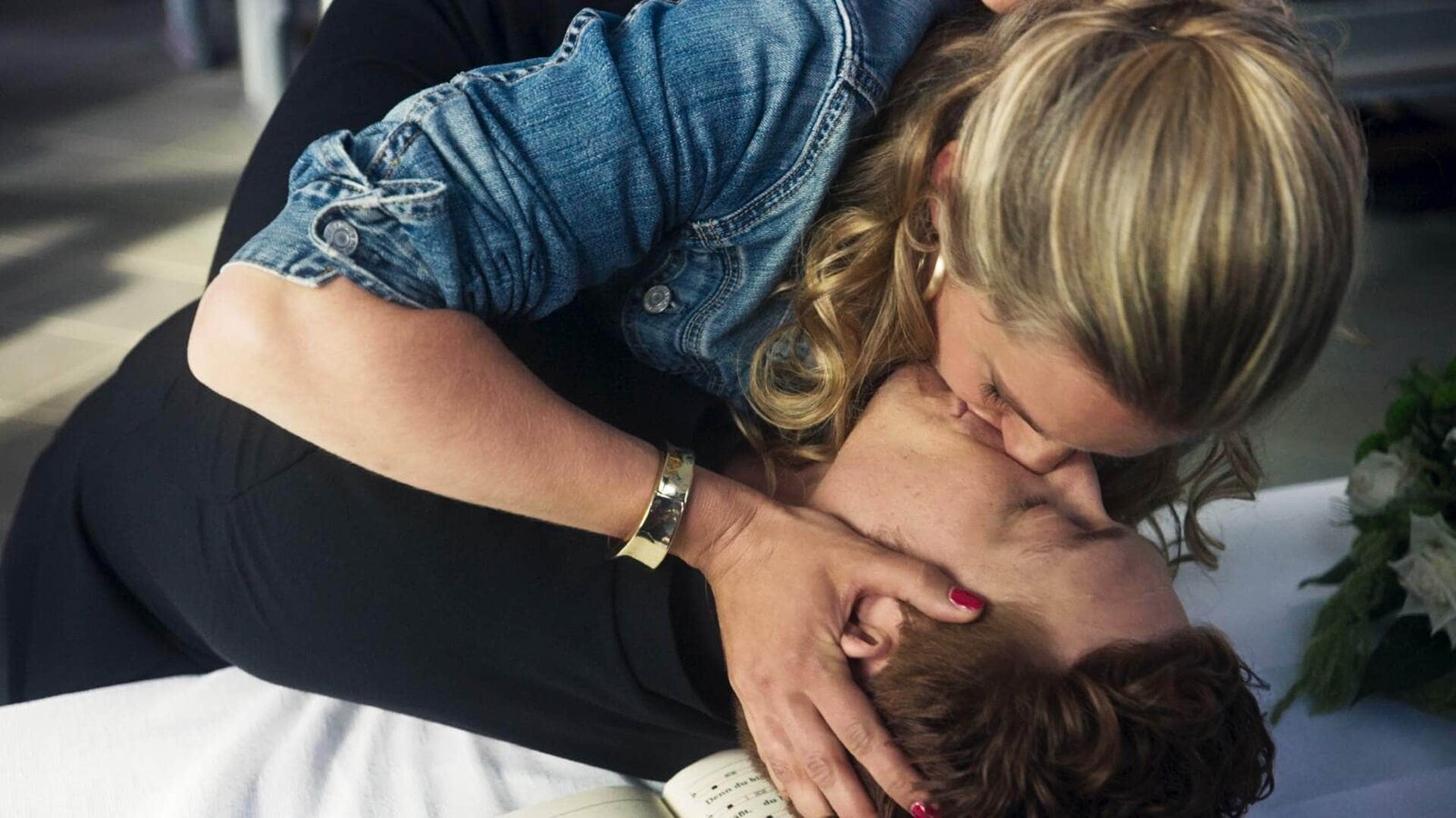 Sie müssen die Braut jetzt küssenMaiks (Daniel Donskoy) Arbeitstag in der Kirche beginnt mit einem unerwarteten Kuss von der frisch verlobten Ellen (Marie Burchard). Nach dem Kuss ist sie fest entschlossen, zu heiraten. Zu Maiks Erleichterung nicht ihn, sondern ihren Verlobten.Bild: © RTL