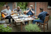 Kjell: Rockabilly forever!Jamsession in Kjells Garten mit seinem Vater Sven (li.), Mundharmonika-Man Hendrik (2.v.r.) und Bassist Fiete (2.v.l.) aus seiner BandBild: © SWR