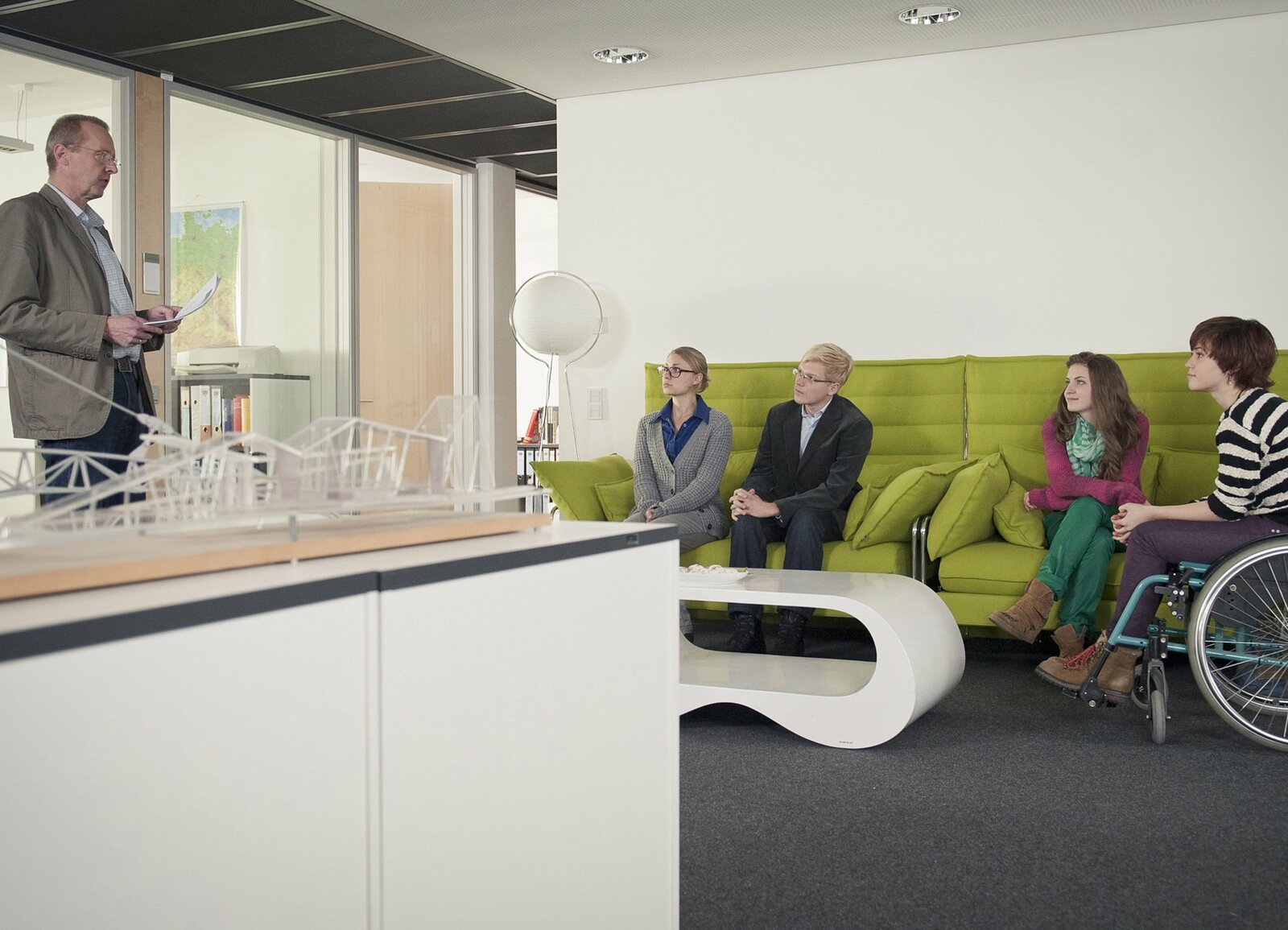 Folge 757Bella (Marie Meinzenbach, 2.v.re.) und Jo (Lena Ladig, re.) haben an einem Test für ein Parktikum im Ingeneurbüro teilgenommen und bekommen das Ergebnis vom Prüfer (Dominik Bender).Bild: © MDR/Anke Neugebauer