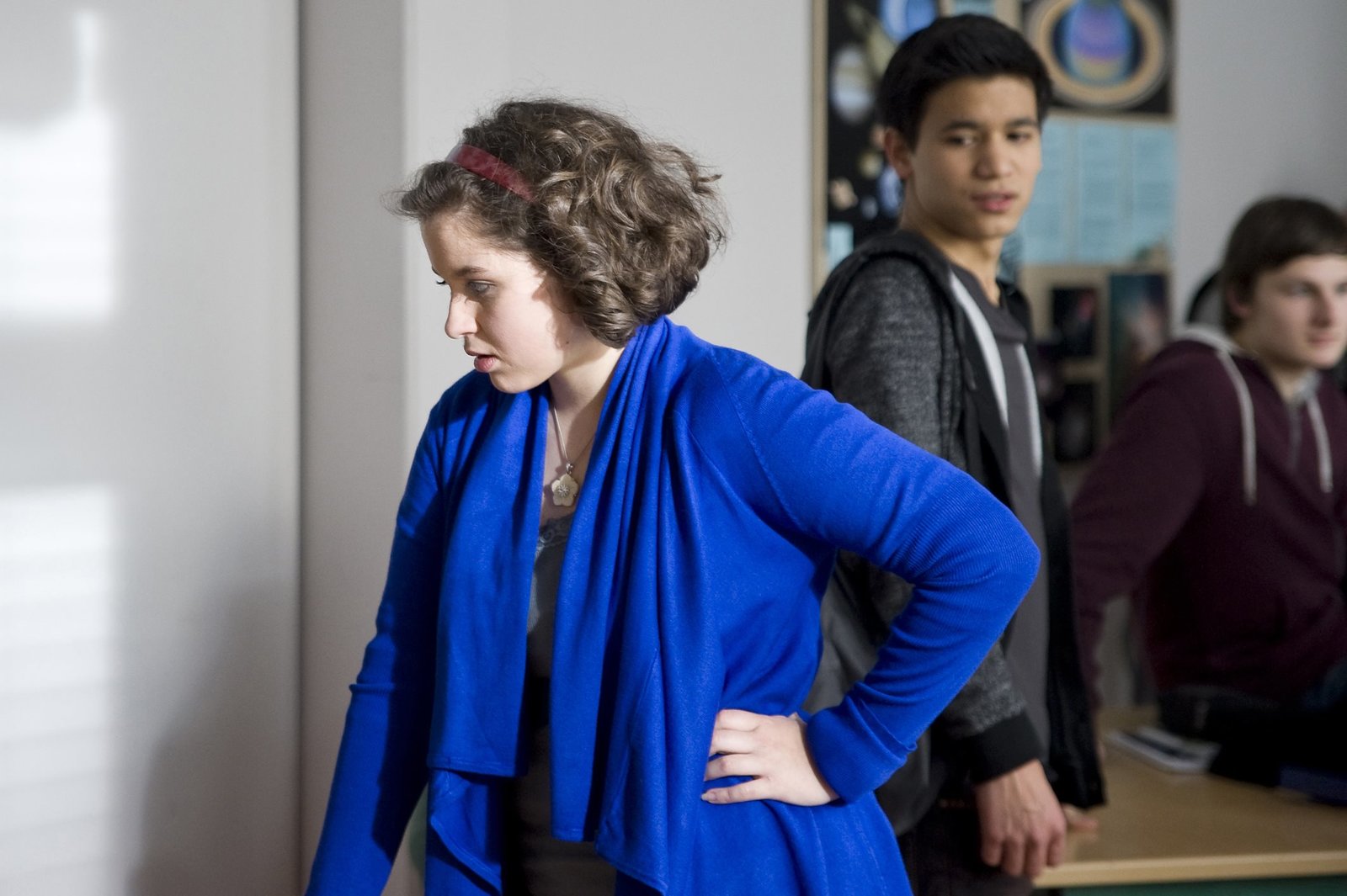 Folge 911Jannis (Maximilian Scharr, mitte) belauscht Olivia (Holly Geddert, links) und Luisa (Tessa Dökel, rechts) bei ihrem Gespräch und erfährt, dass die Schülersprecherwahl gefälscht worden ist.ÂBild: © MDR/Saxonia Media/Felix Abraham