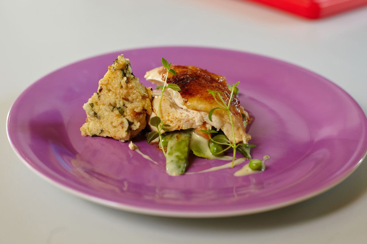 Ganzes Huhn mit buntem GemüseHuhn mit Semmelfülle, Karotten und Erbsen.Bild: © ORF