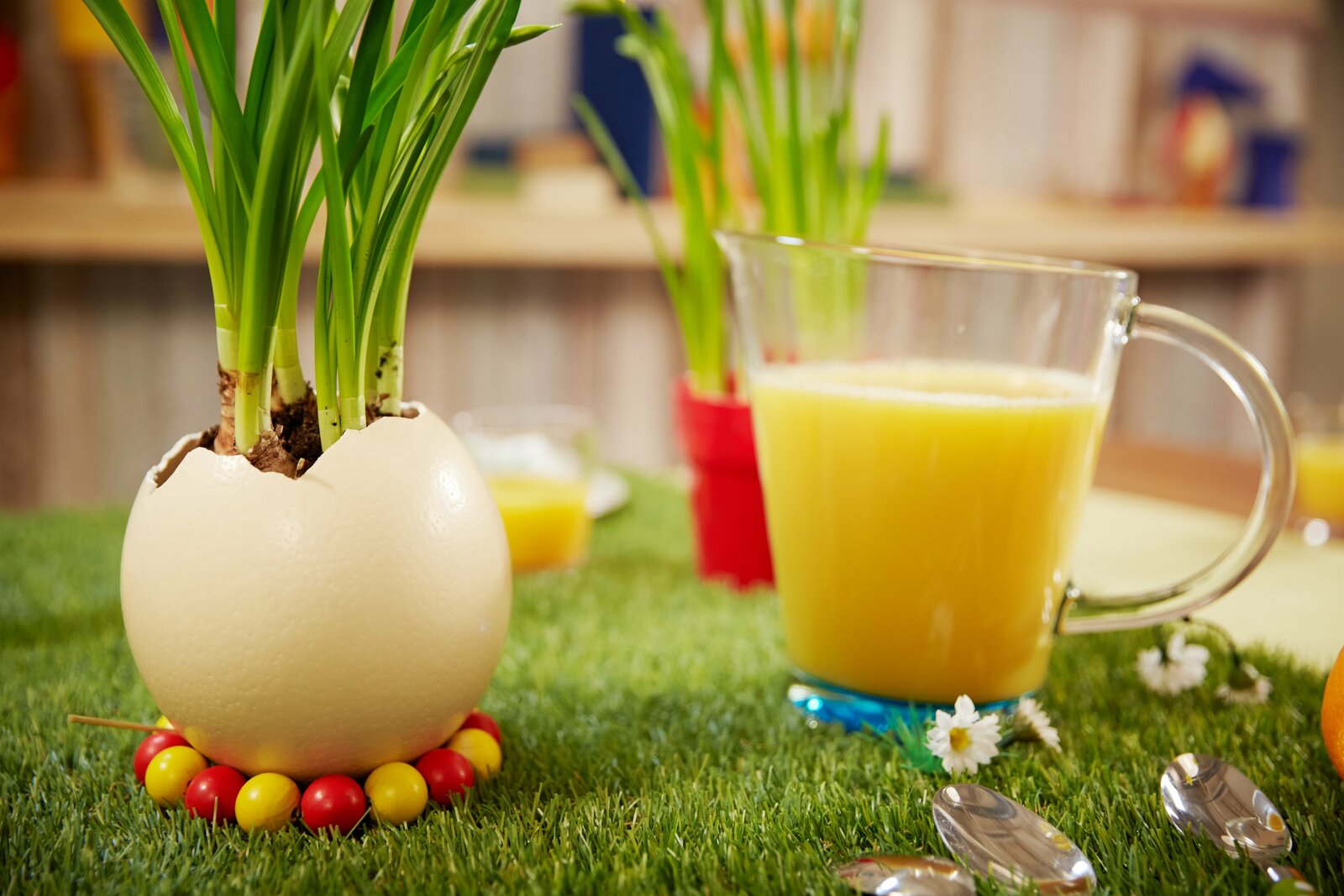 BrunchTischdeko mit Blumentopf aus Straußenei.Bild: © ORF 1