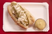 Hot DogIn Hot Dog Brötchen gepackt, mit Senf und Sauerkraut getoppt, überraschen die Fleischer mit ihrer selbstgemachten Bratwurst.Bild: © ZDF/ORF/René Rothkopf