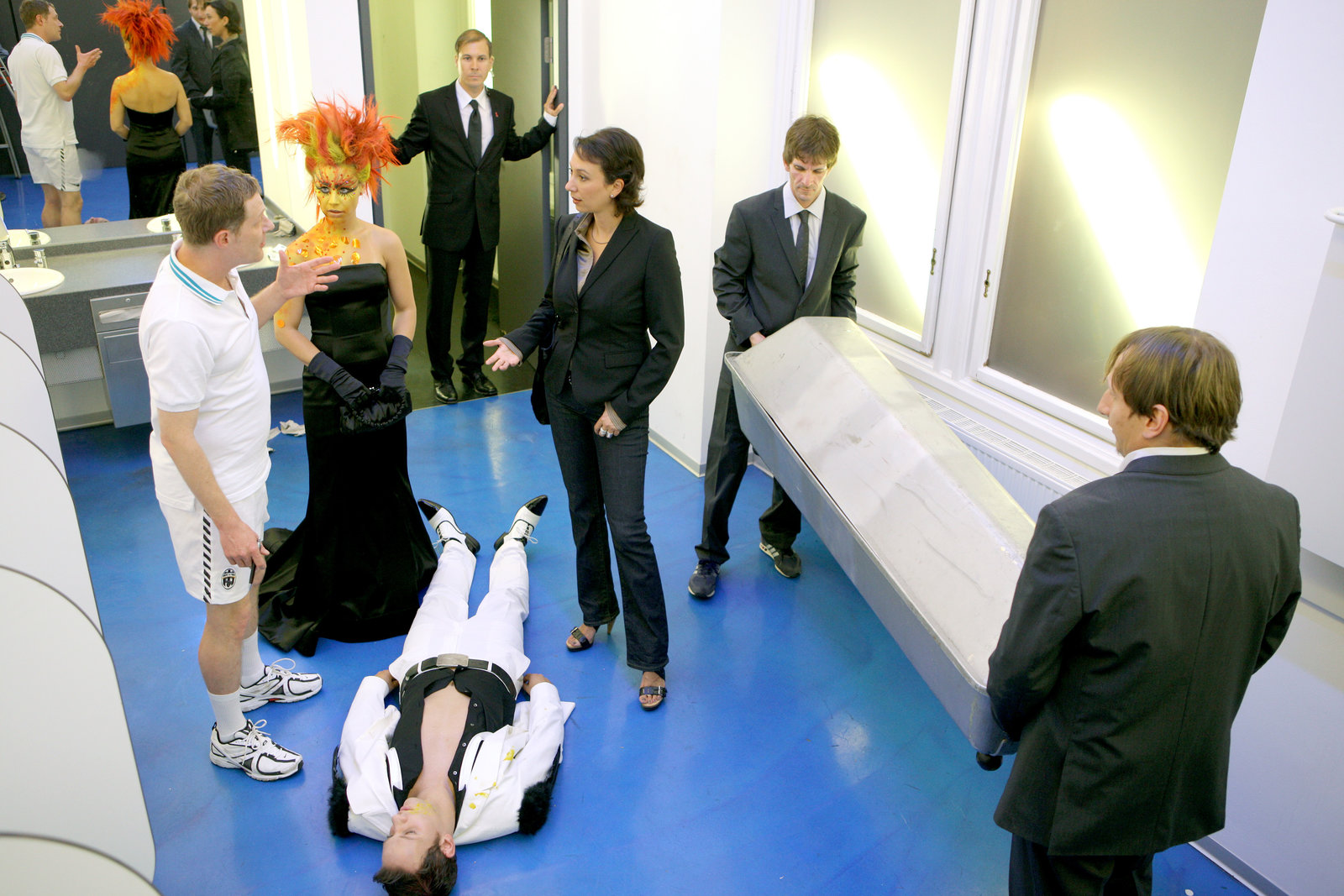 Klaus Karner"Schnell ermittelt", "Klaus Karner." Klaus Karner haucht sein Leben während des Wiener Life Balls am Herrenklo aus. Maja, die sich unter den Gästen befindet, verteidigt den Tatort so lange, bis Angelika eingetroffen ist. Als sich herausstellt, dass Karner ein Polizist und homosexuell war, scheint alles auf einen Mord im Schwulenmilieu hinzudeuten. Doch es geht um nichts Geringeres als um die Macht der Liebe.Im Bild (v.li.): Andreas Lust (Stefan Schnell), Katharina Straßer (Maja Landauer), David Miesmer (Klaus Karner), Thomas Groß (Securtity), Ursula Strauss (Angelika Schnell).Bild: © One