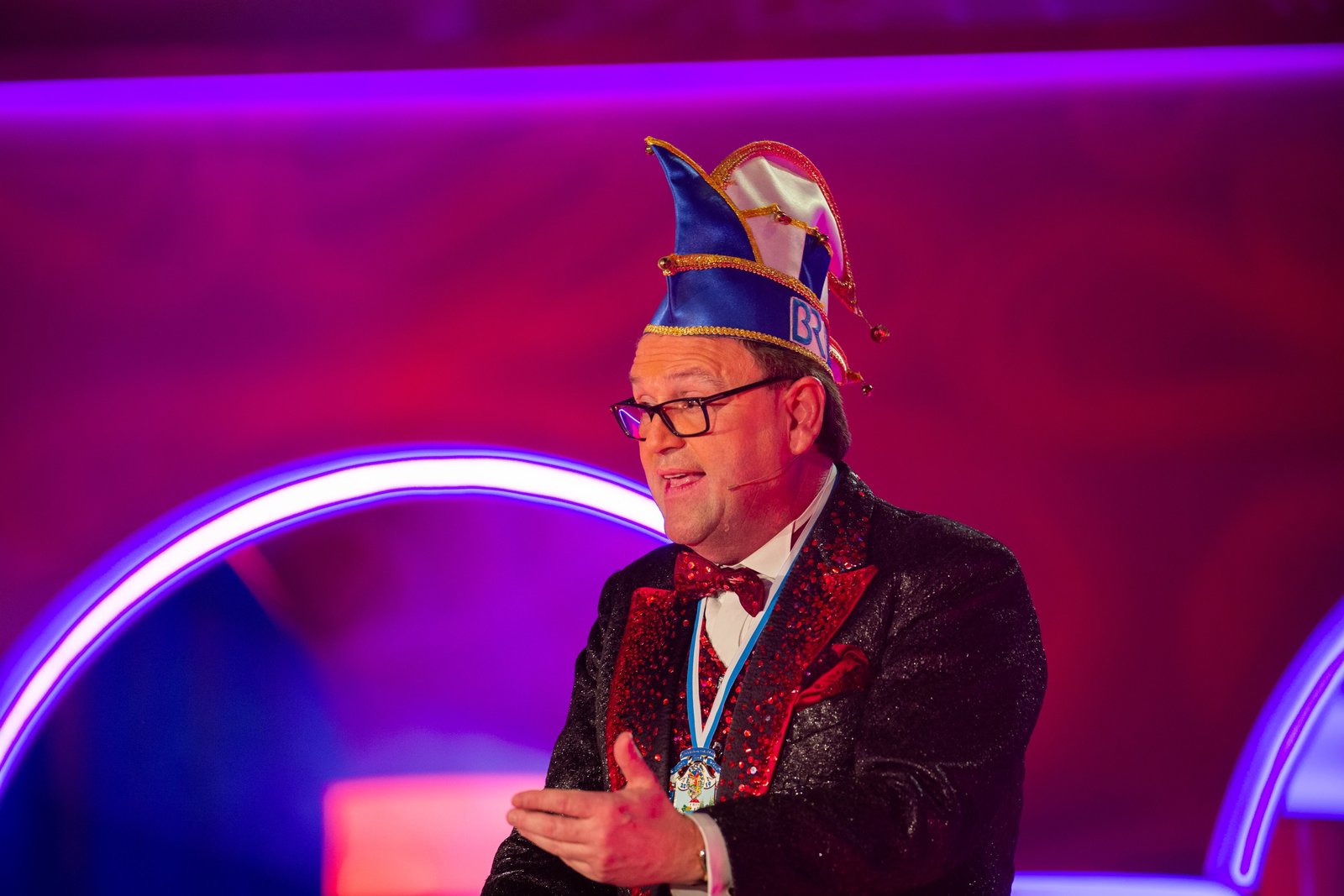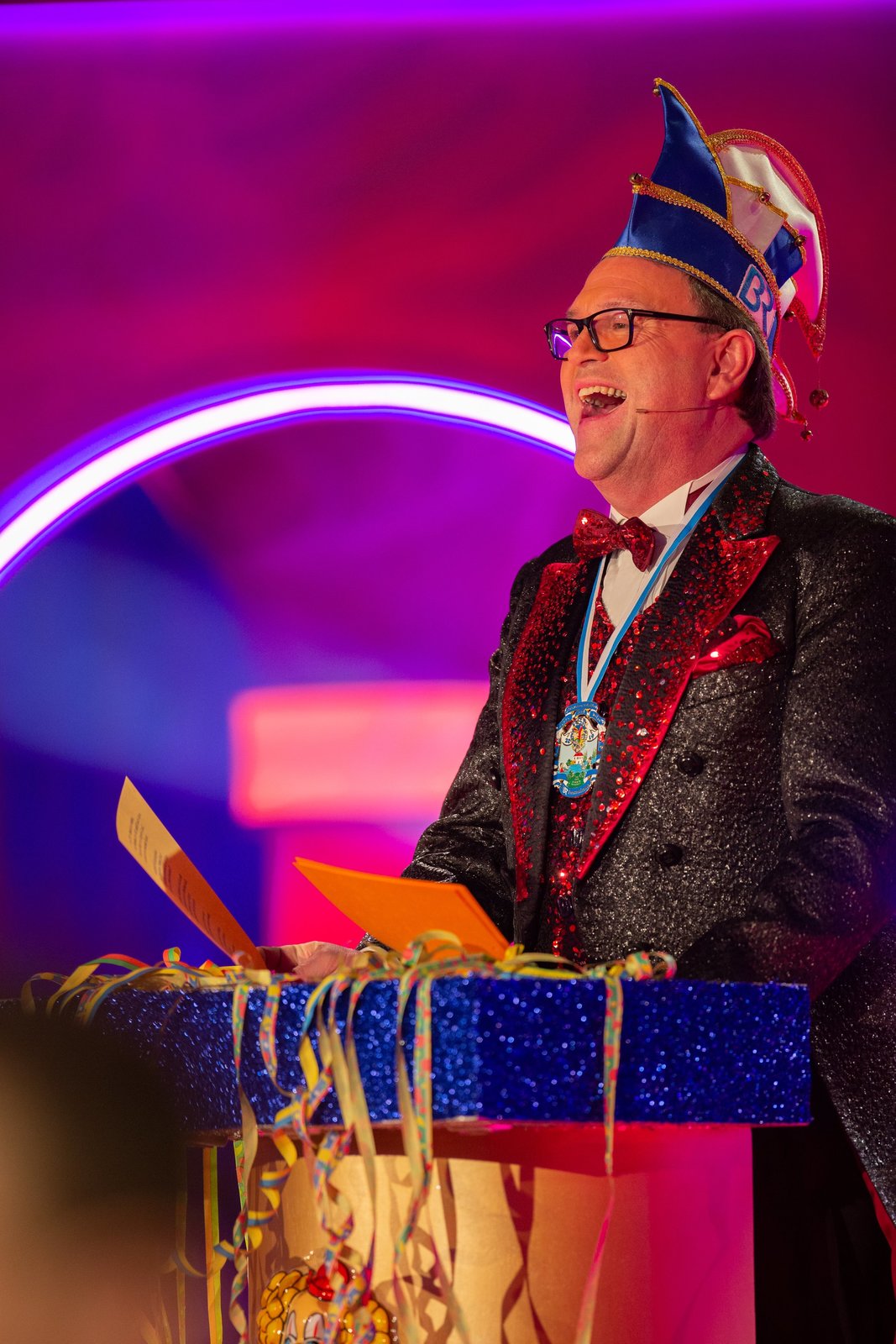 2018SWR Fernsehen NÄRRISCHE WOCHEN IM SÜDWESTEN, "Schwaben weissblau - Hurra und helau", am Sonntag (28.01.18) um 20:15 Uhr. Sitzungspräsident Georg Ried führt durch den Abend und kümmert sich gemeinsam mit seinem Elferrat bewährt um die Einhaltung des närrischen Protokolls.Bild: © SWR/BR/Ralf Wilschewski / SWR-Presse/Bildkommunikation