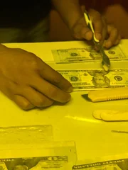 TigerhandelLima, Peru - A Finisher putting the finishing texture on counterfeit bills.Bild: © Muck Media / National Geographic